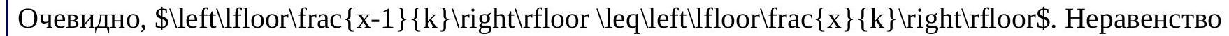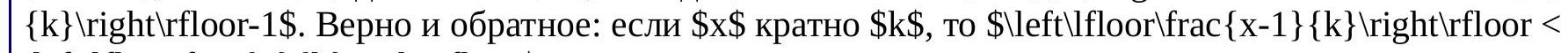 \$ \left\lfloor \left| \frac{\mathrm{x}-1}{\mathrm{k}} \right| \right\rfloor < \left\lfloor \left| \frac{\mathrm{x}}{\mathrm{k}} \right| \right\rfloor = m \$ means that \$ \mathrm{x}-1 < \mathrm{k} \mathrm{m} \leq \mathrm{x} \$, from which \$ x = k m \$, that is, \$ x \$