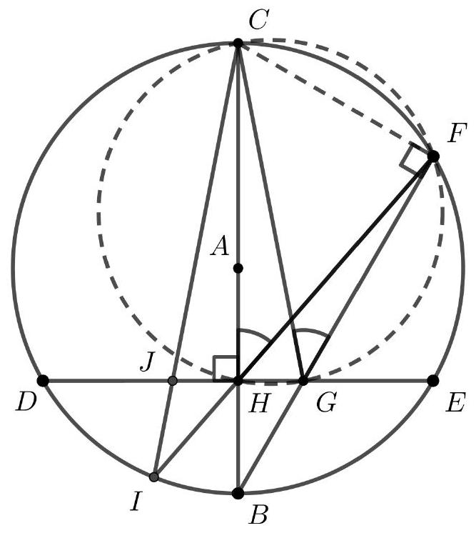 b) Observing the circle $\Gamma$ again, we can conclude that $\angle HCG = \angle HFG$, as both are inscribed in the arc $GH$. Considering now the circle with diameter $BC$, we have $\angle ICB = \angle IFB$, because both are inscribed in the arc $IB$. Thus, $\angle ICH = \angle BFH = \angle HFG = \angle HCG$. Therefore, since the right triangles $CHG$ and $CHJ$ have the same angles and a common leg, they are congruent, resulting in $HJ = GH = 2 \text{ cm}$.