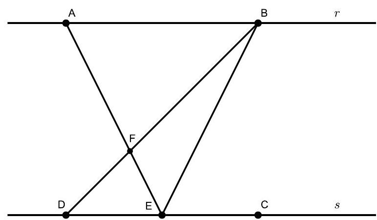 b) If $\frac{A_{B F E}}{A_{D F E}}=2$, then $\frac{B F}{F D}=2$. If $r / / s$, then $\triangle A B F \sim \triangle D E F$, with a ratio of 2, and consequently, $\frac{A B}{D E}=2$, it follows that $E$ is the midpoint of segment $C D$, that is, $\frac{D E}{E C}=1$.