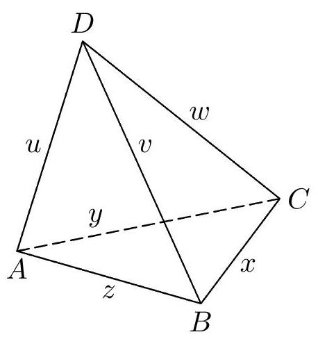 Consider, therefore, an arbitrary tetrahedron $ABCD$ and describe the lengths of its edges with the letters $x, y, z, u, v, w$ as shown in Fig. 3. We will divide all nets of the tetrahedron $ABCD$ into two groups. The first group will include those nets in which one face of the tetrahedron is adjacent to the other three faces;