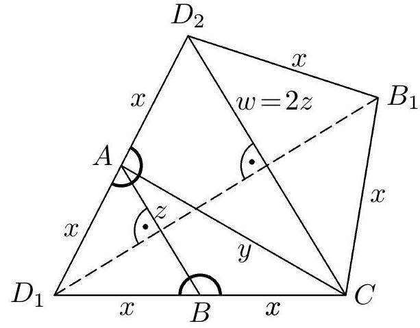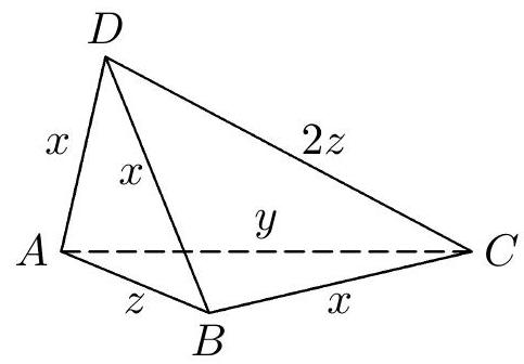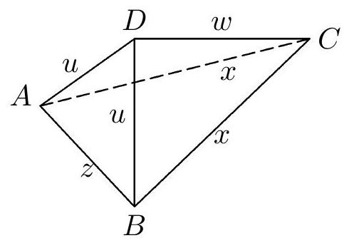 Fig. 3 in addition to the inequality $2u \neq w$, the inequality $z \neq x$ must also hold; in the net from Fig. 7a, it must be true that $2u = x + v$ and $x = v$, hence $x = u = v$. In the triangle $D_2D_1C$, the segment $AB$ is the midline (Fig. 7a), so $w = |D_2C| = 2|AB| = 2z$. The corresponding tetrahedron is shown in Fig. 7b.