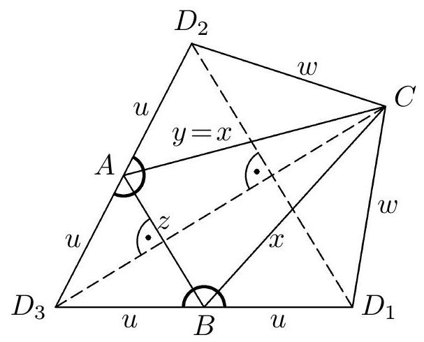 The net in Fig. 4 is (in general) a hexagon $AD_3BD_1CD_2$, it will be a quadrilateral only if two of its angles at the vertices $A, B, C$ are right (i.e., have a size of $180^\circ$). It is clear that a right angle cannot be at any of the vertices $D_1, D_2, D_3$. Considering the already mentioned arbitrariness of labeling, let us assume that the angles $D_2AD_3$ and $D_3BD_1$ (marked in Fig. 4) are right. Our net is then a quadrilateral $D_2D_3D_1C$, whose sides (in the order in which they cyclically follow each other) have lengths $2u, 2v, w$, and $w$. If this quadrilateral is a kite (and not a rhombus), it must certainly be true that $u=v$ and $2u \neq w$ (Fig. 6a). From the axial symmetry with respect to the line $D_3C$, we then find that $y=x$; the tetrahedron with the "kite-shaped" net from Fig. 6a is shown in Fig. 6b. It is a tetrahedron symmetric with respect to the plane of symmetry of the edge $AB$. Let us add that