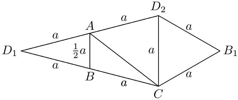 Let's summarize the results of our previous considerations: Only two types of tetrahedra (Figs. 6b and 7b) have a net in the shape of a kite. Our task is now to determine when these tetrahedra have exactly four equal edges (of a given length $a$). Let's first consider the tetrahedron from Fig. 6b, whose edges have lengths $x, x, z, u, u, w$. Suppose, therefore, that exactly four of them are equal to $a$, which ones are they? First, it must be true that $x = a$, otherwise it would have to be true that $a = z = u = w$, which is in contradiction with the inequality $z < 2u$, hence $x > z$. In the same net, the triangle $ABC$ has an obtuse interior angle at vertex $B$, because its exterior angle $ABD_1$ is the interior angle at the base $AB$ of the isosceles triangle $ABD_1$, so it is necessarily acute. Therefore, the longest side of the triangle $ABC$ is the side $AC$, which we can write as: $y > \max \{x, z\}$. Together, we get $y > x > z$, with respect to the equality $x = a$, it follows that $2z = a$. The tetrahedron $ABCD$ is thus uniquely (up to congruence) determined by the found conditions. The length of the last edge $AC$ we calculate as the median to the side $D_1D_2$ of the triangle $CD_1D_2$ with sides $2a, 2a, a$. We get $y = \frac{1}{2}a\sqrt{6}$. The solution to our problem is the unique tetrahedron from Fig. 8a, and its net in the shape of a kite is in Fig. 8b.