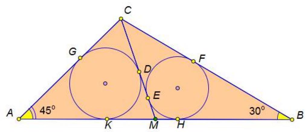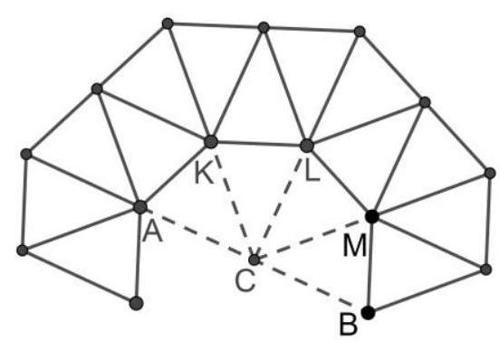 In the original triangles, the angle at the vertex is $45^{\circ}$. Therefore, the other two angles are each $62.5^{\circ}$. Then the angle $\angle C K L = 360^{\circ} - 62.5^{\circ} - 62.5^{\circ} - 45^{\circ} - 45^{\circ} - 62.5^{\circ} = 62.5^{\circ}$. Therefore, triangles $A K C$ and $K L C$ are equal by two sides and the angle between them. Similarly, it can be proven that triangles $L M C$ and $M B C$ are equal to the original ones. Then the angle $\angle A C B$ is $4 \times 45^{\circ} = 180^{\circ}$, which means points $A, C, B$ lie on the same line. Therefore,