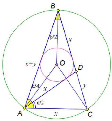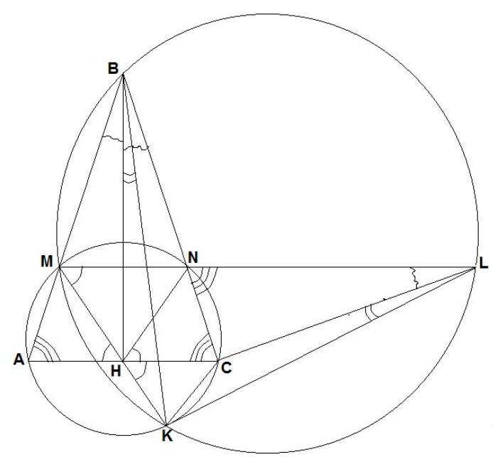 Solution: Let's denote the points $K, L, M$, as shown in the figure. We will construct an isosceles triangle $A K C$ equal to the original one. Connect vertex $C$ to other points as shown in the figure.