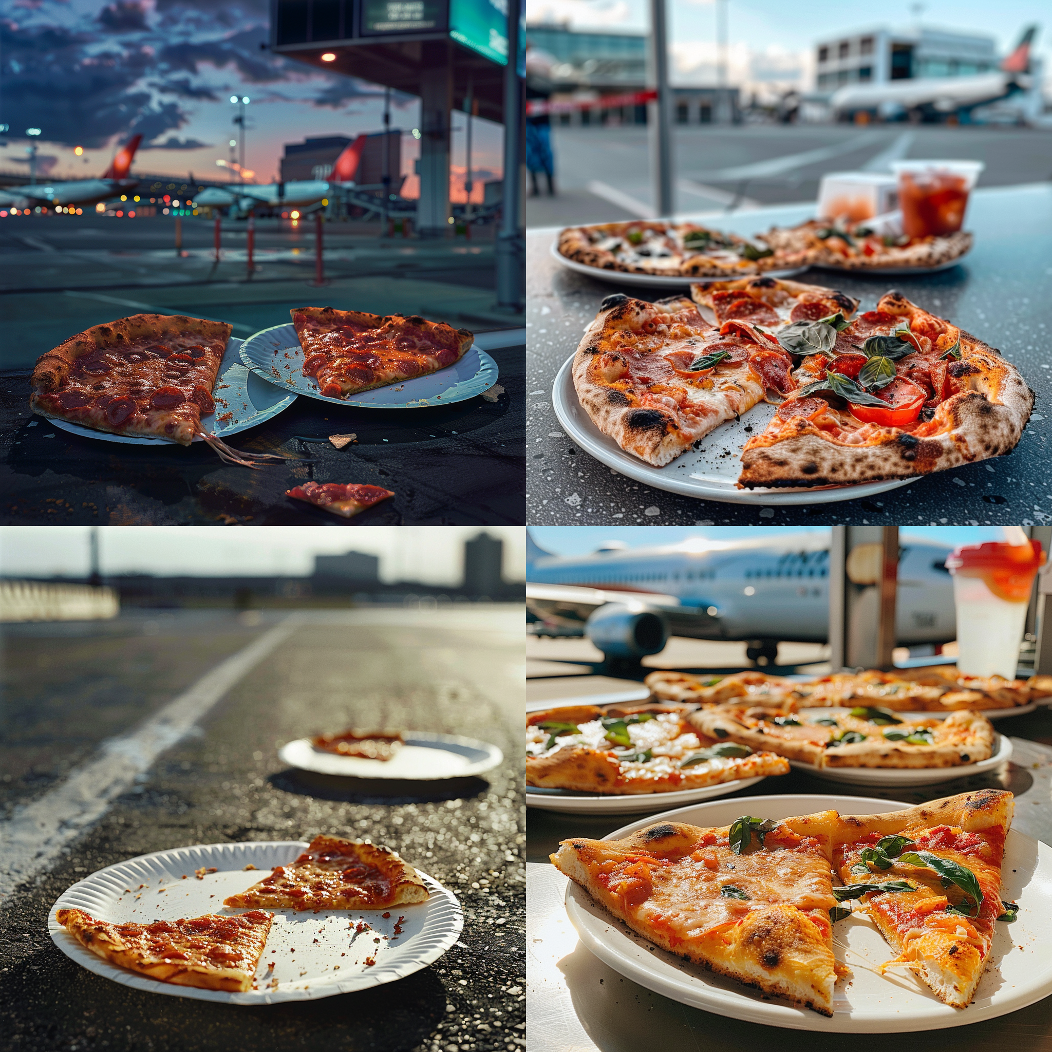 Plates with pieces of pizza on a street A city street at an airport --seed 1930870296 --ar 1:1 --v 6 | 2024-03-17T03:38:35Z | |
