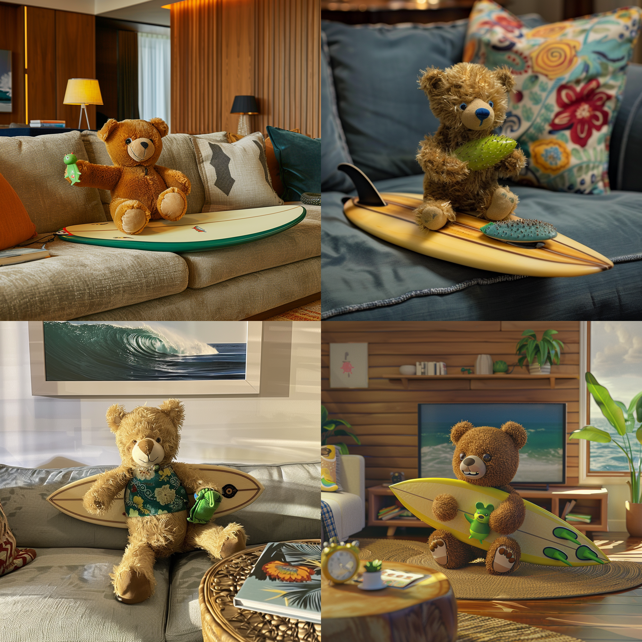 A living area playing A stuffed bear holding a green thing on his surfboard --seed 2301333981 --ar 1:1 --v 6 | 2024-03-17T04:08:32Z | |