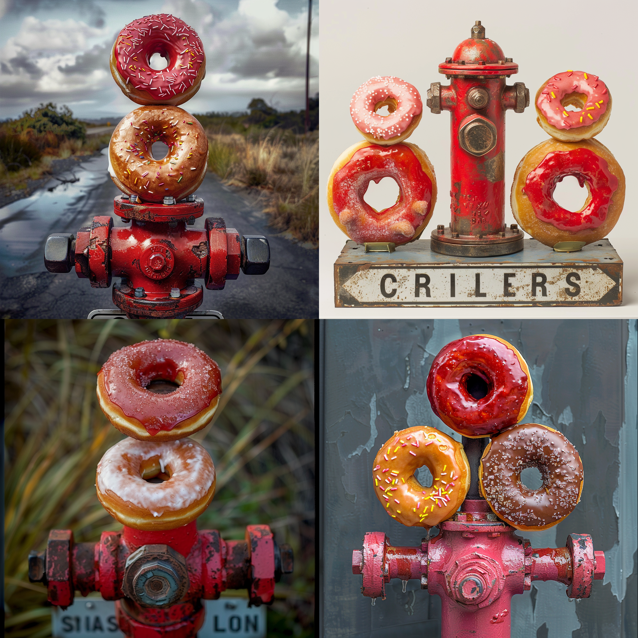 Three different glazed doughnuts on a red toped fire hydrant on a road sign --seed 2004043203 --ar 1:1 --v 6 | 2024-03-17T04:09:25Z | |