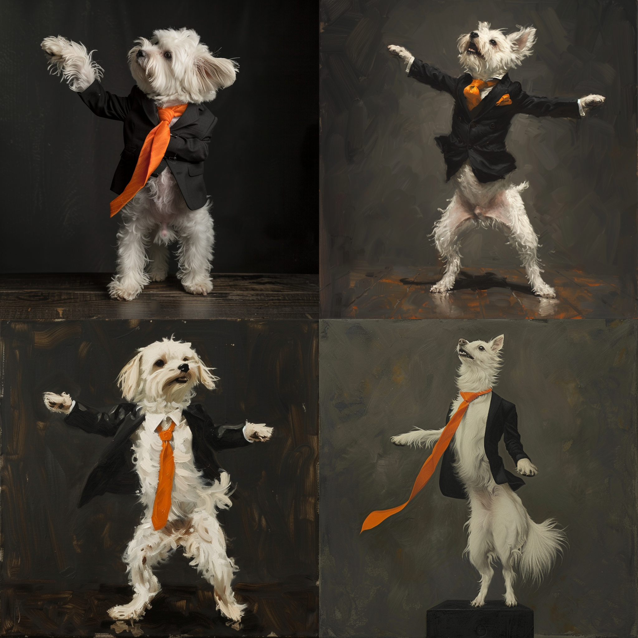 A white dog standing on top of a black suit dances with an orange tie --seed 301711184 --ar 1:1 --v 6 | 2024-03-17T04:16:07Z | |