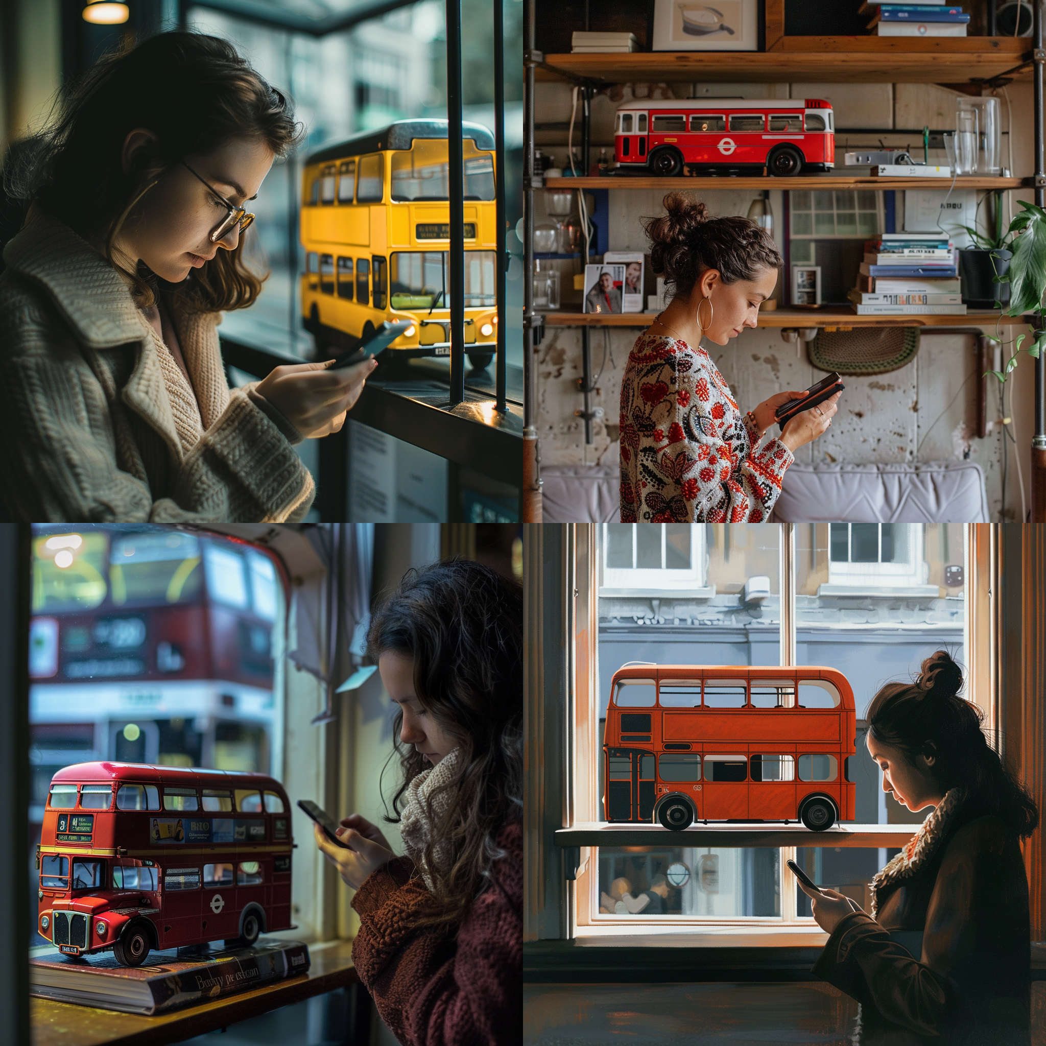 A woman looking at their cell phone with Double Decker bus is parked on a shelf --seed 3233624584 --ar 1:1 --v 6 | 2024-03-17T04:14:55Z | |