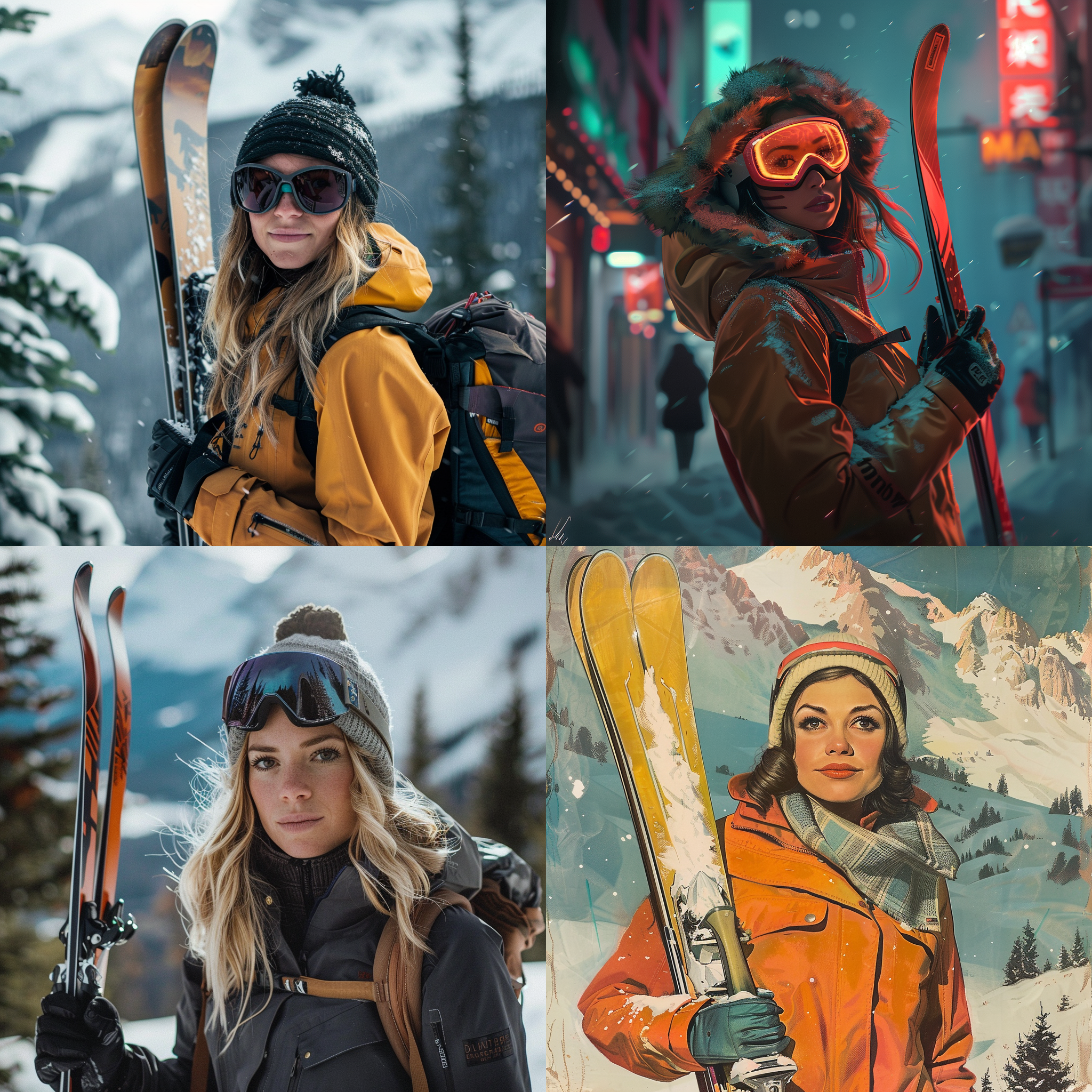 A woman holding skis at the game to resume --seed 663307587 --ar 1:1 --v 6 | 2024-03-17T04:17:54Z | |