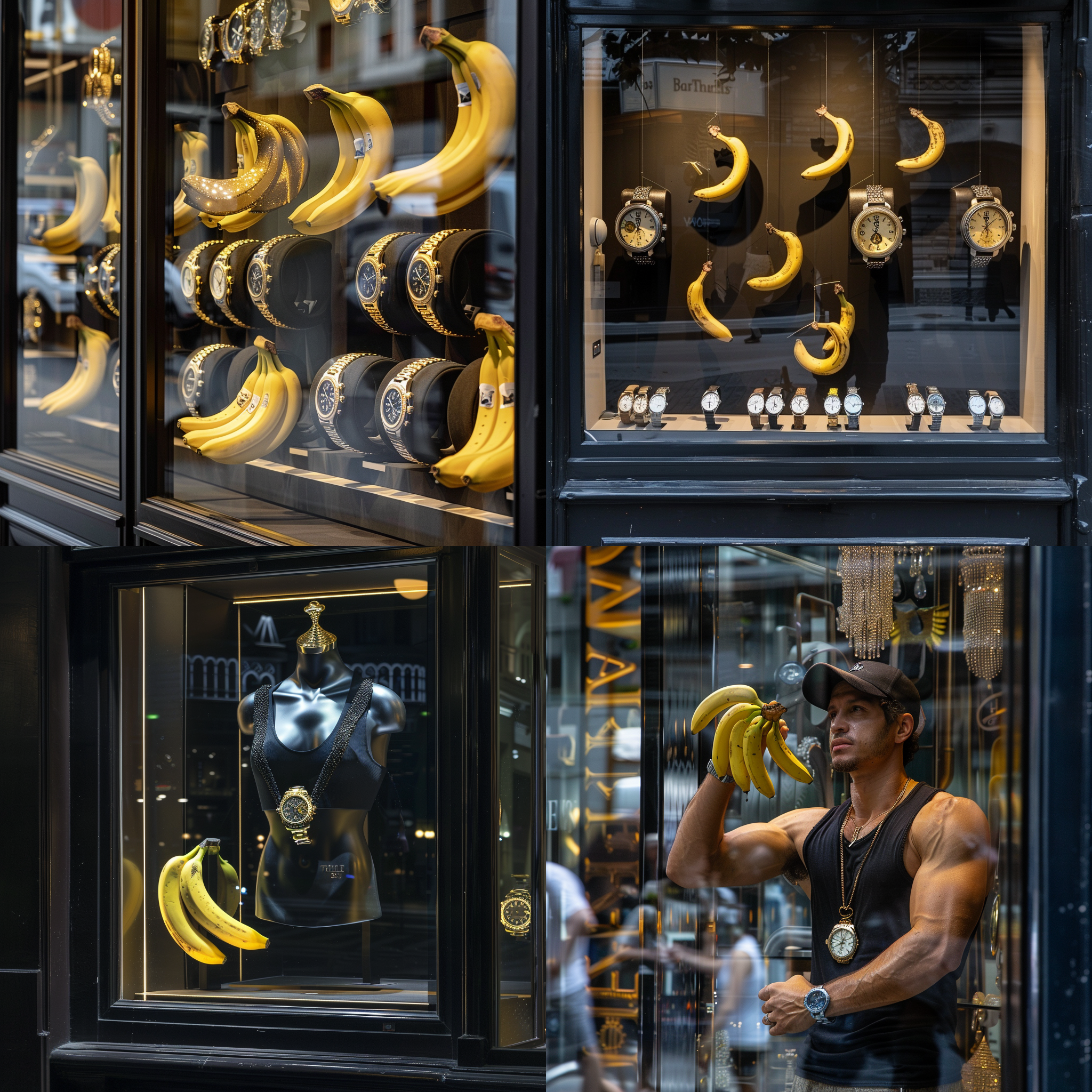 Window display of watches in a black tank top holds a banana --seed 21303198 --ar 1:1 --v 6 | 2024-03-17T04:15:59Z | |