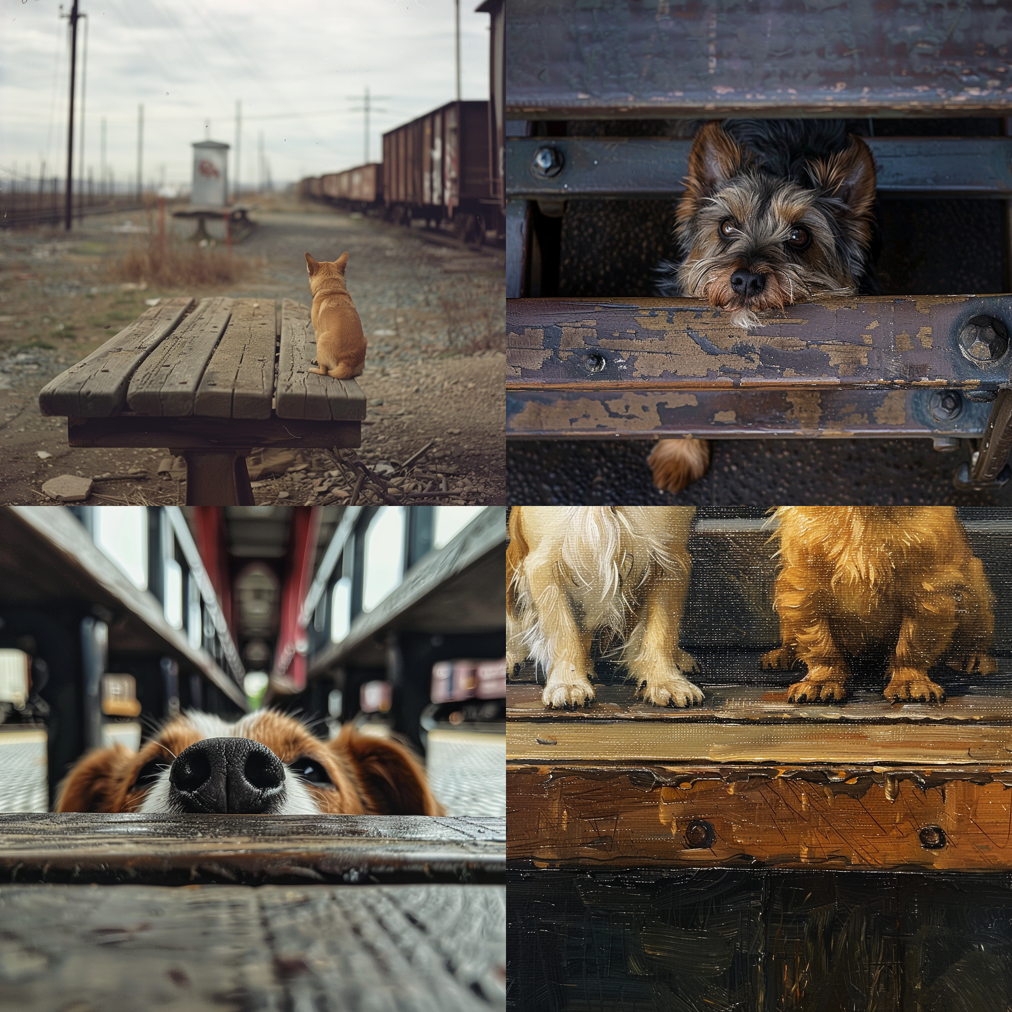 The bottom of a small dog that is on the bench in train yard with one another --seed 3140007794 --ar 1:1 --v 6 | 2024-03-17T04:18:02Z | |