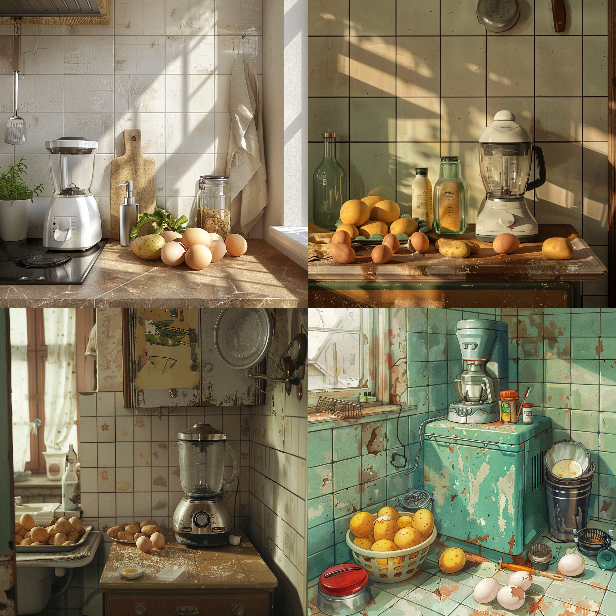 A bathroom area with a blender, eggs and potatoes --seed 116400870 --ar 1:1 --v 6 | 2024-03-17T04:19:41Z | |
