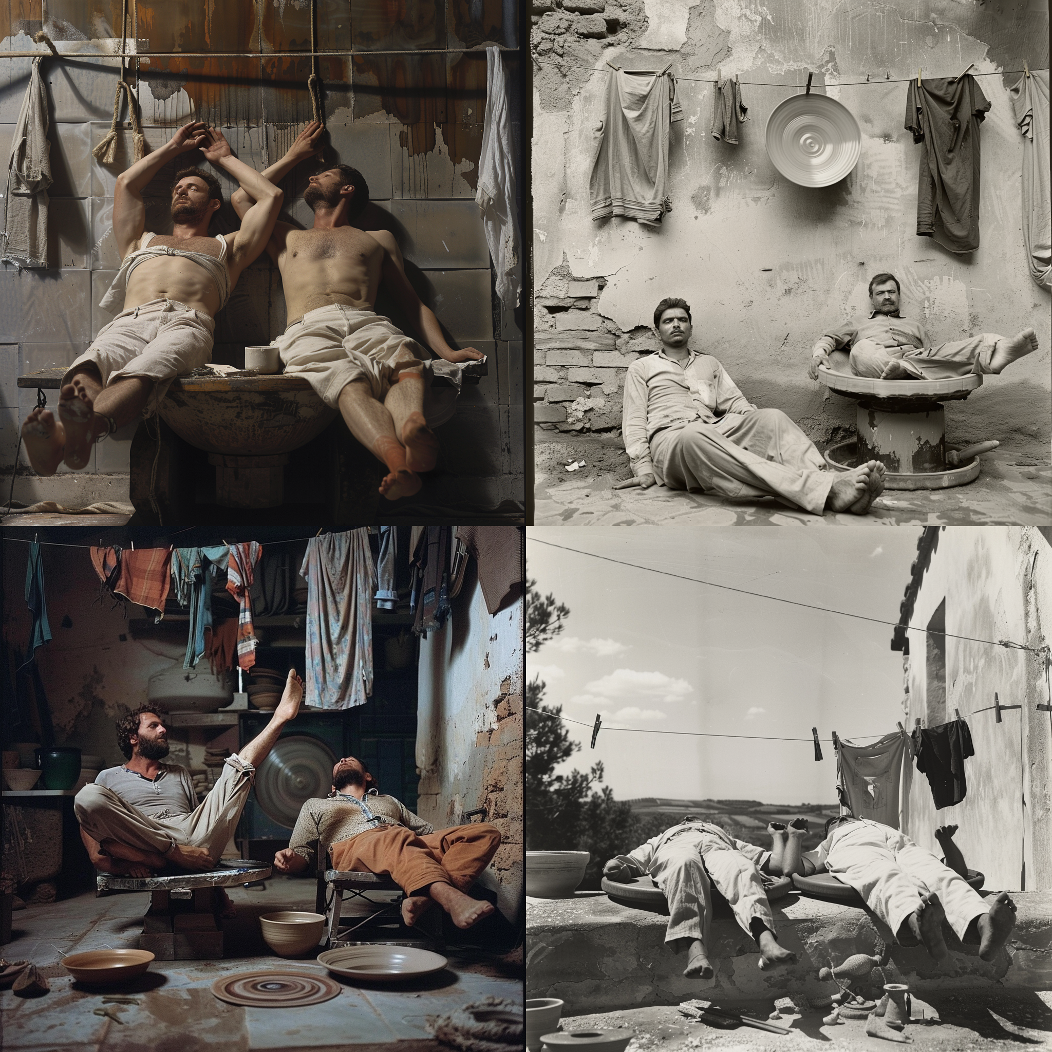 Two men who are laying out on a clothesline and a pottery wheel --seed 3537161438 --ar 1:1 --v 6 | 2024-03-17T04:11:41Z | |