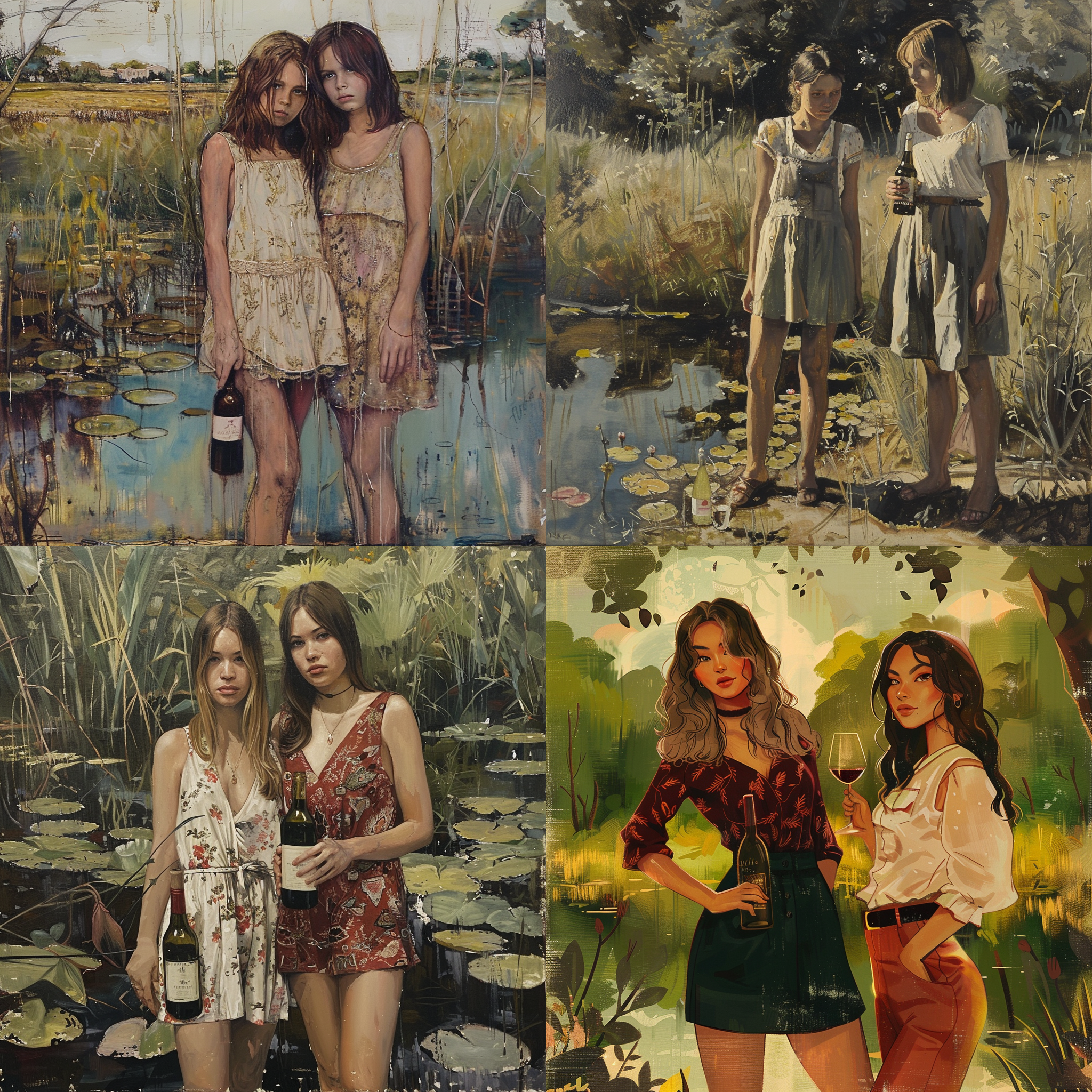 Two girls standing next to a bottle of wine by a pond --seed 1349243633 --ar 1:1 --v 6 | 2024-03-17T04:07:04Z | |
