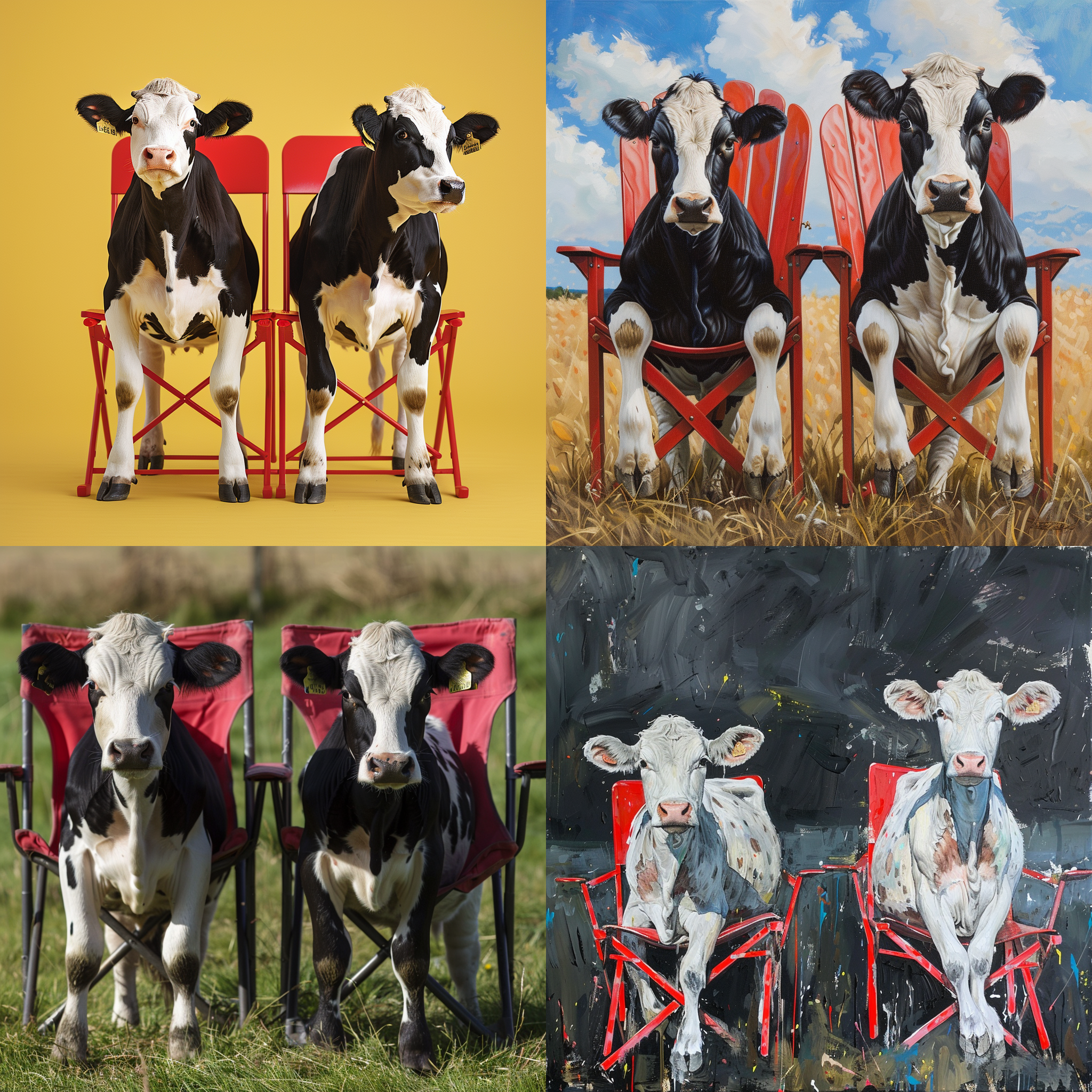 Two cows are in the center of the red foldable chair --seed 2416909803 --ar 1:1 --v 6 | 2024-03-17T04:05:13Z | |