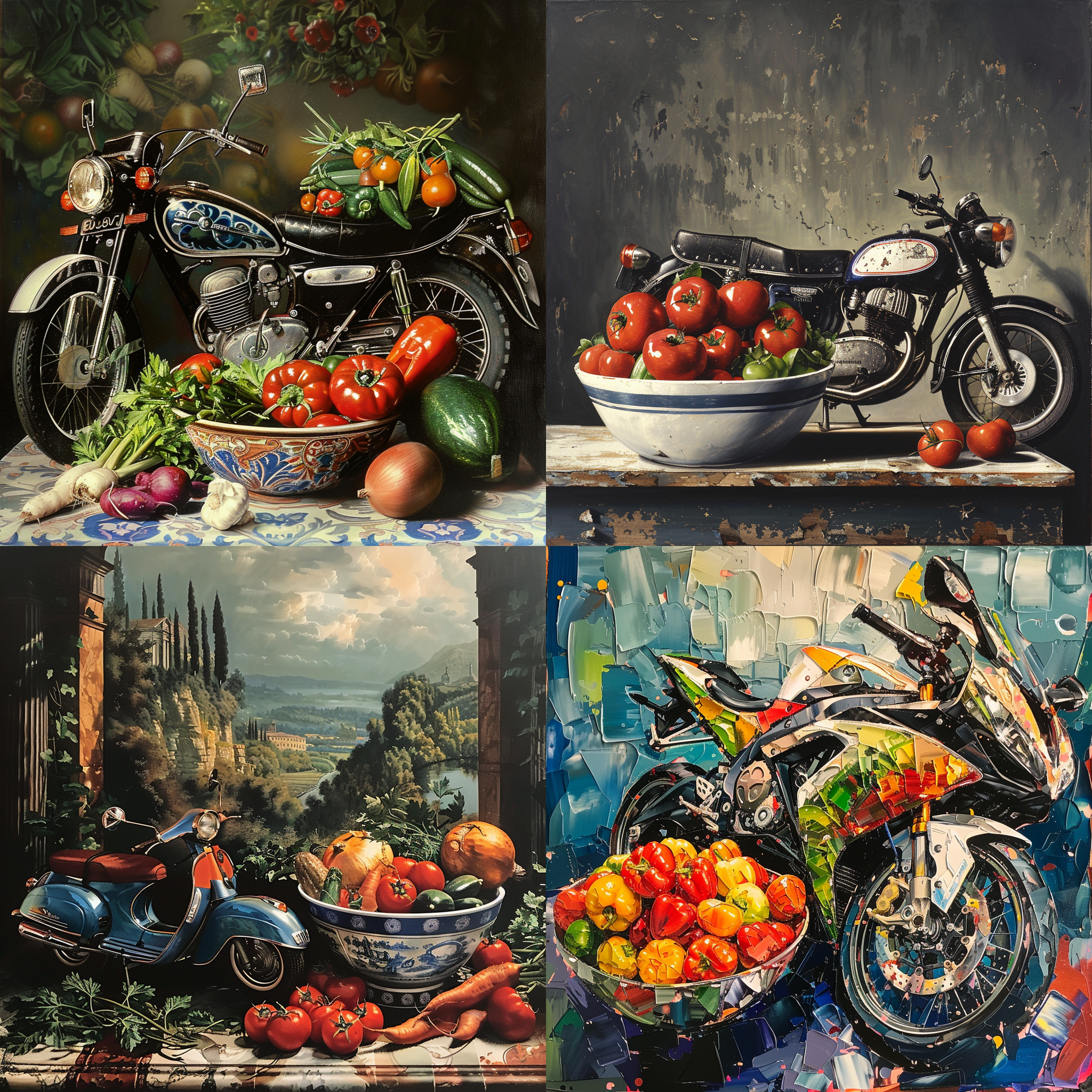 A motor cycle Two bowls with vegetables --seed 1456195566 --ar 1:1 --v 6 | 2024-03-17T04:13:24Z | |