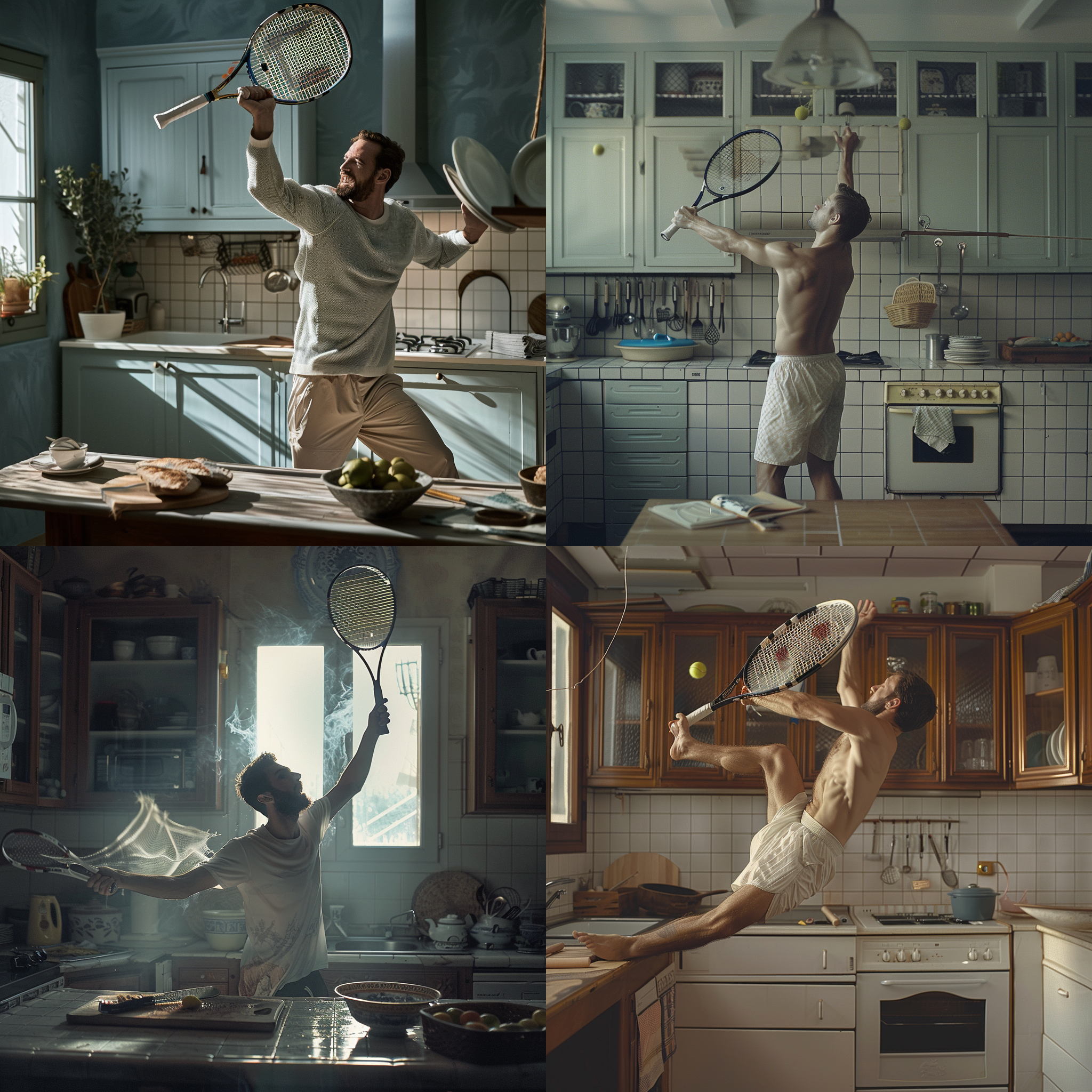 A man swinging a tennis net in a kitchen counter --seed 570081778 --ar 1:1 --v 6 | 2024-03-17T04:04:20Z | |