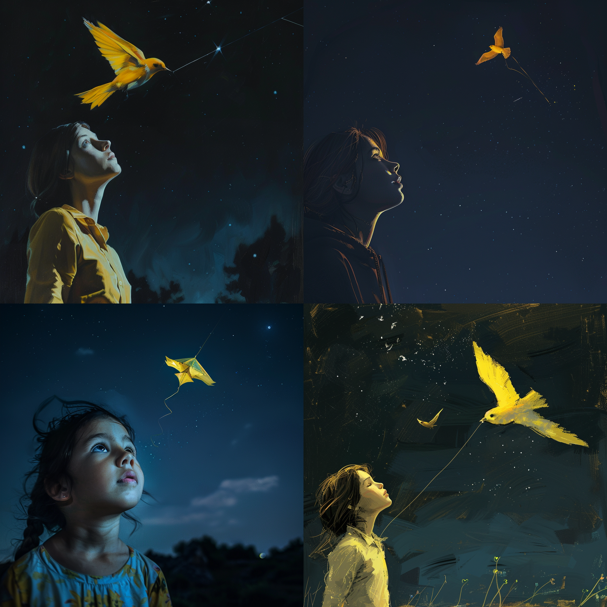 Girl looking up at night A yellow bird is flying his kite into the camera --seed 492757773 --ar 1:1 --v 6 | 2024-03-17T04:18:40Z | |