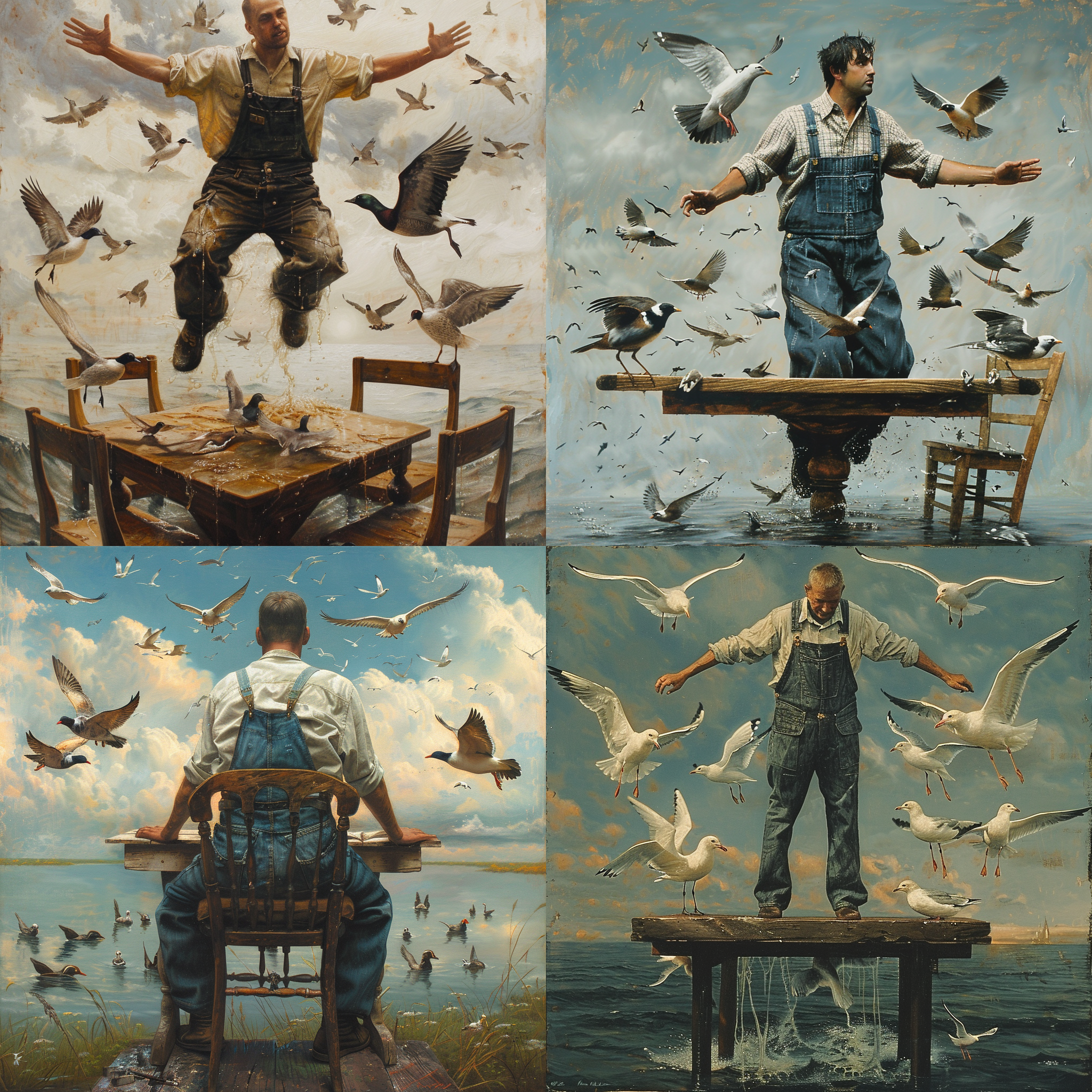 A man wearing overalls is flying over the water Birds around a table --seed 258291650 --ar 1:1 --v 6 | 2024-03-17T06:25:30Z |