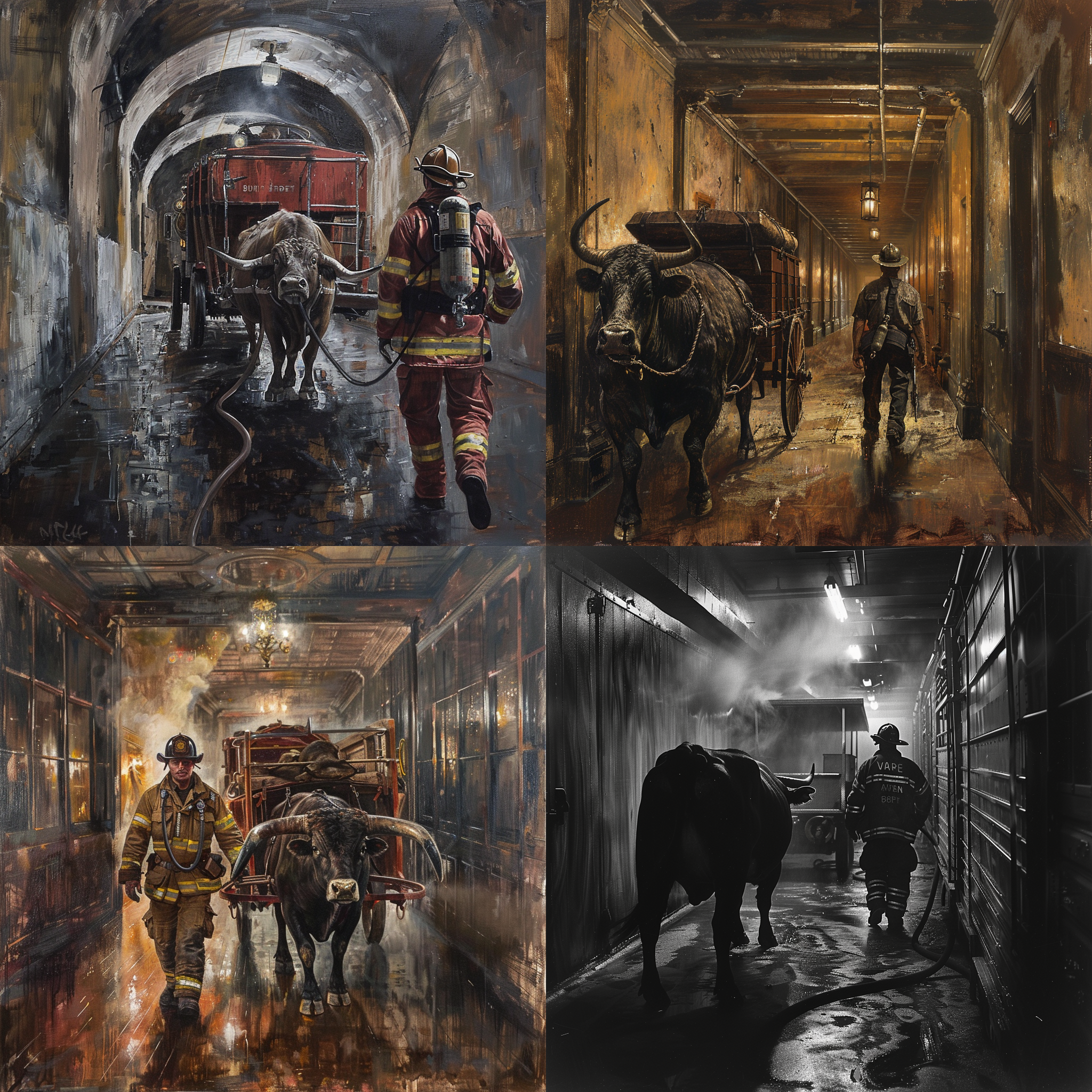 A fire fighter inspecting a bull driven wagon down a hall way --seed 2785376612 --ar 1:1 --v 6 | 2024-03-17T06:12:43Z | |