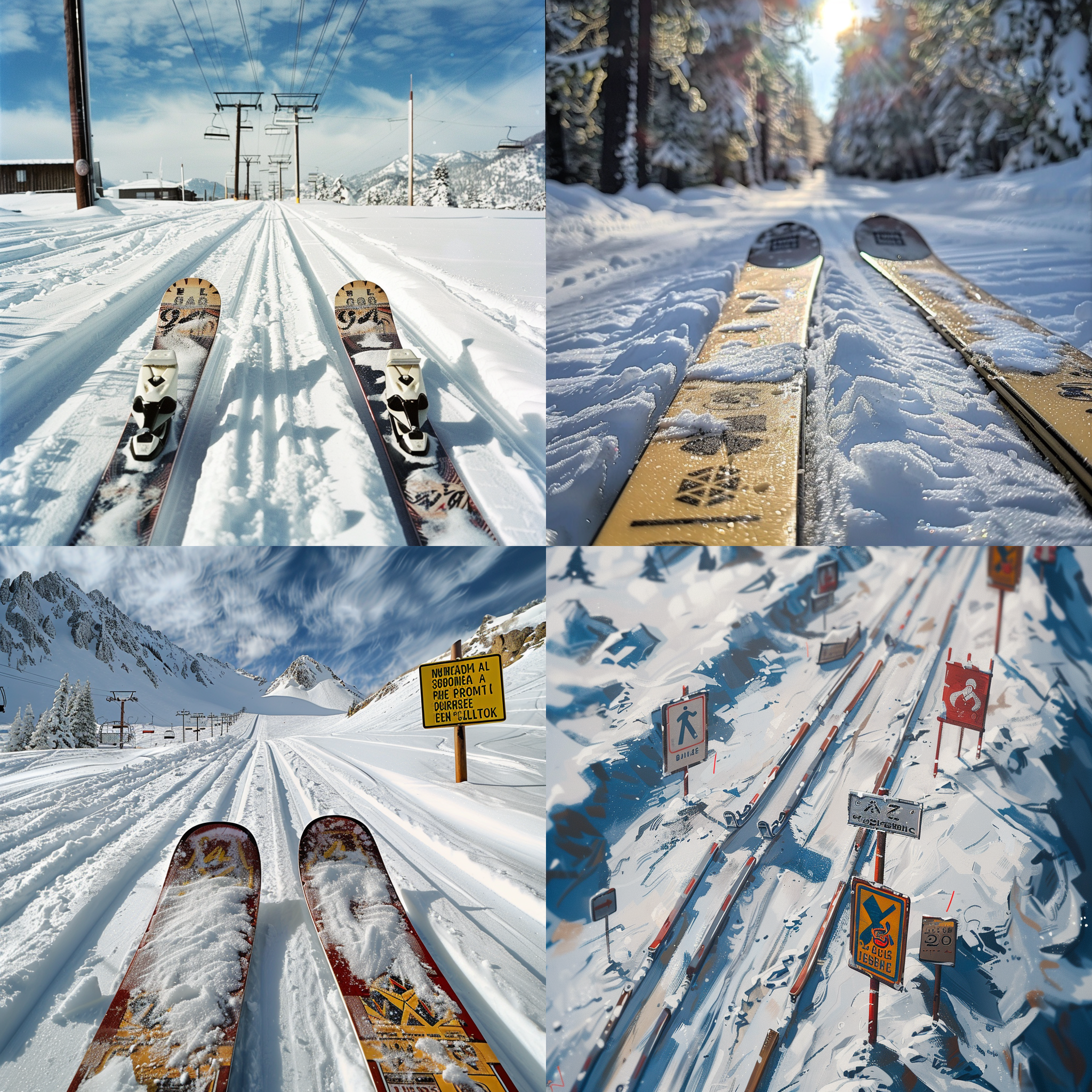 Several signs that are on snow skis going down tracks --seed 893342669 --ar 1:1 --v 6 | 2024-03-17T06:11:38Z | |