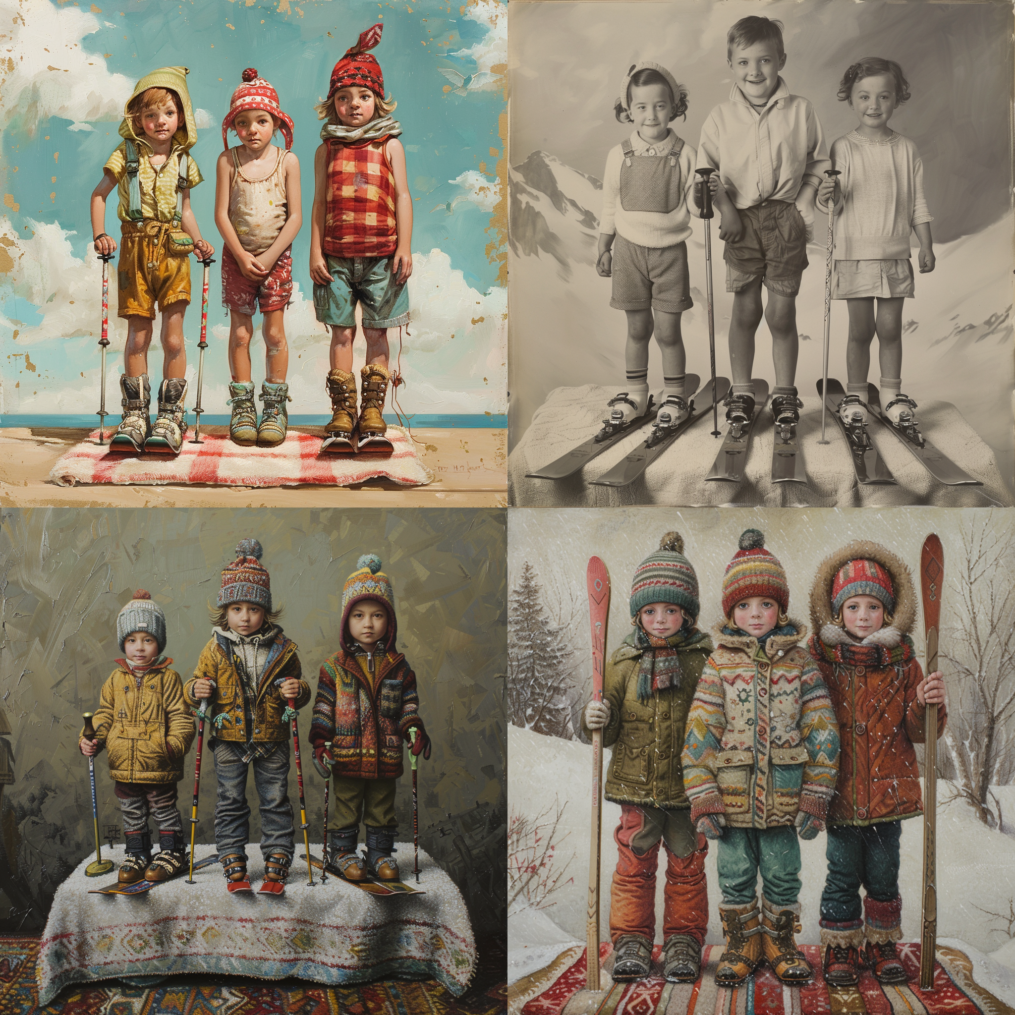 Three kids with skis or standing on a towel on a table --seed 3792185066 --ar 1:1 --v 6 | 2024-03-17T10:40:53Z | |