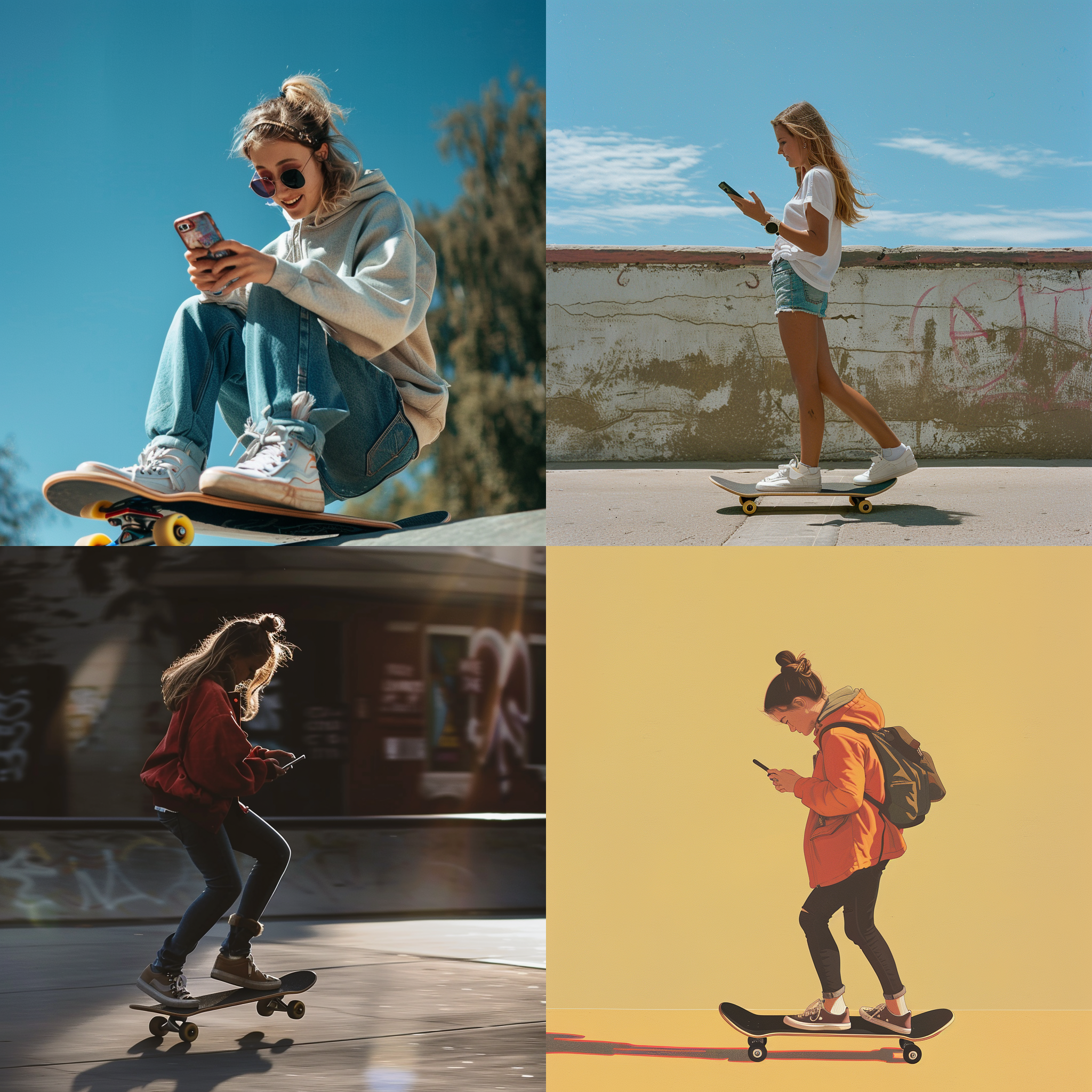 A woman rides a skateboard using the cell phone --seed 2413124579 --ar 1:1 --v 6 | 2024-03-17T10:38:32Z | |