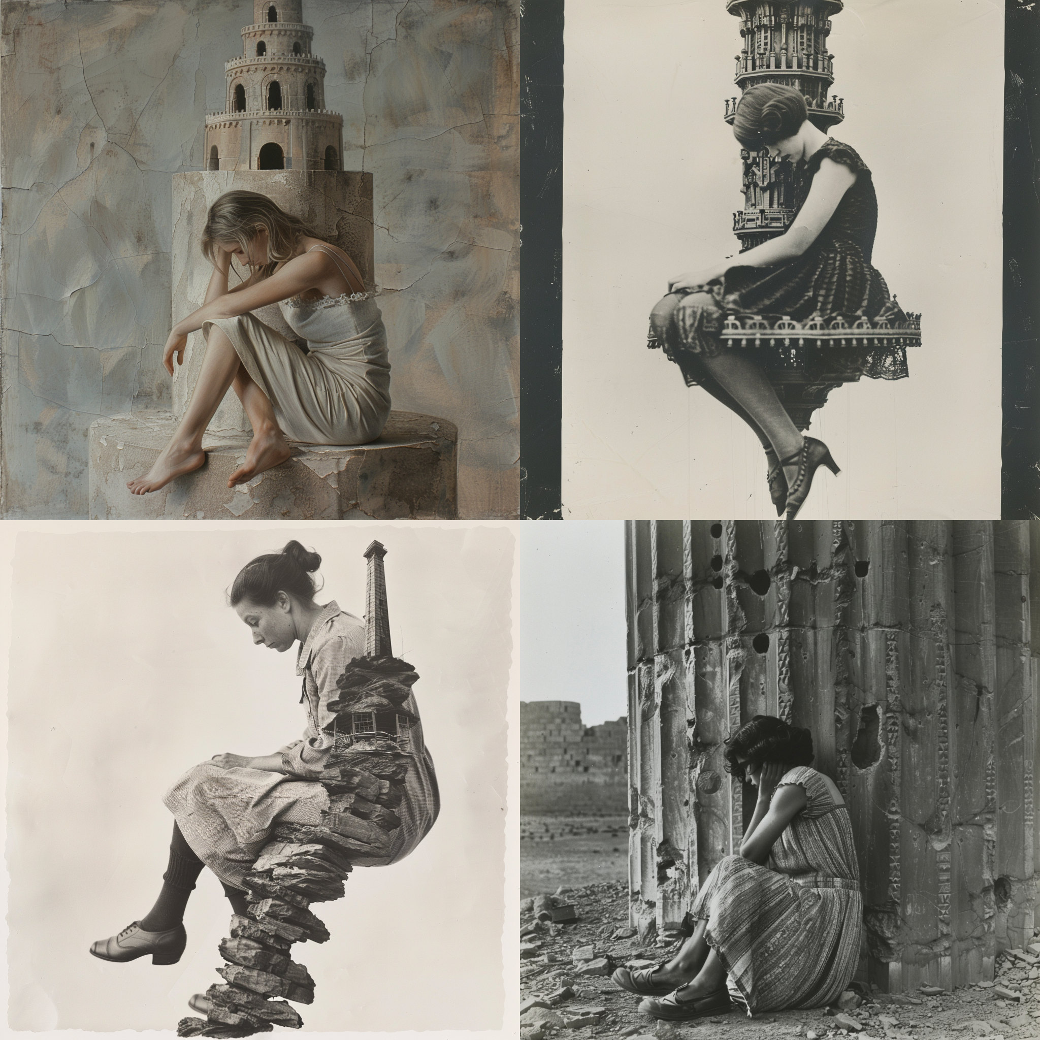 A shoeless woman is sitting down Large tower like structure on it --seed 1184238284 --ar 1:1 --v 6 | 2024-03-17T10:42:38Z | |
