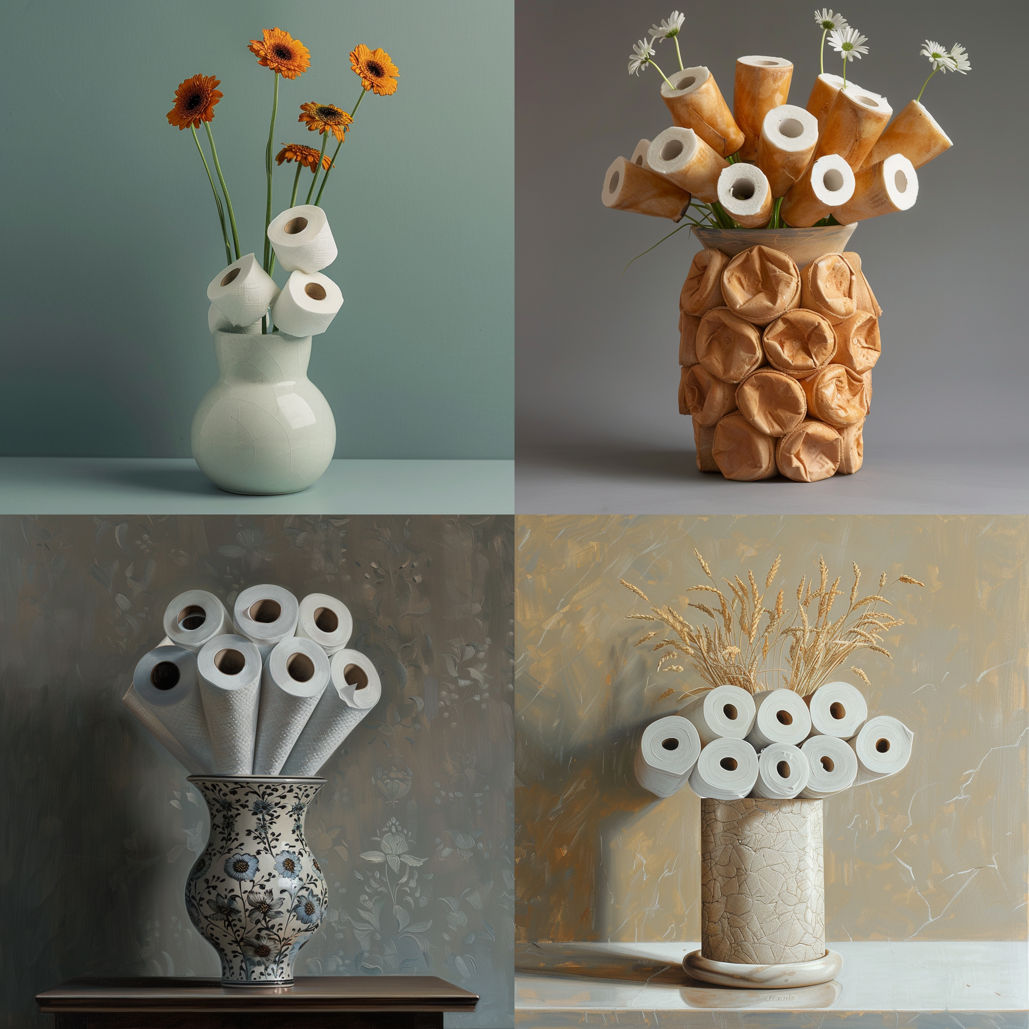Rolls of toilet in a vase --seed 1750786223 --ar 1:1 --v 6 | 2024-03-17T10:42:50Z | |