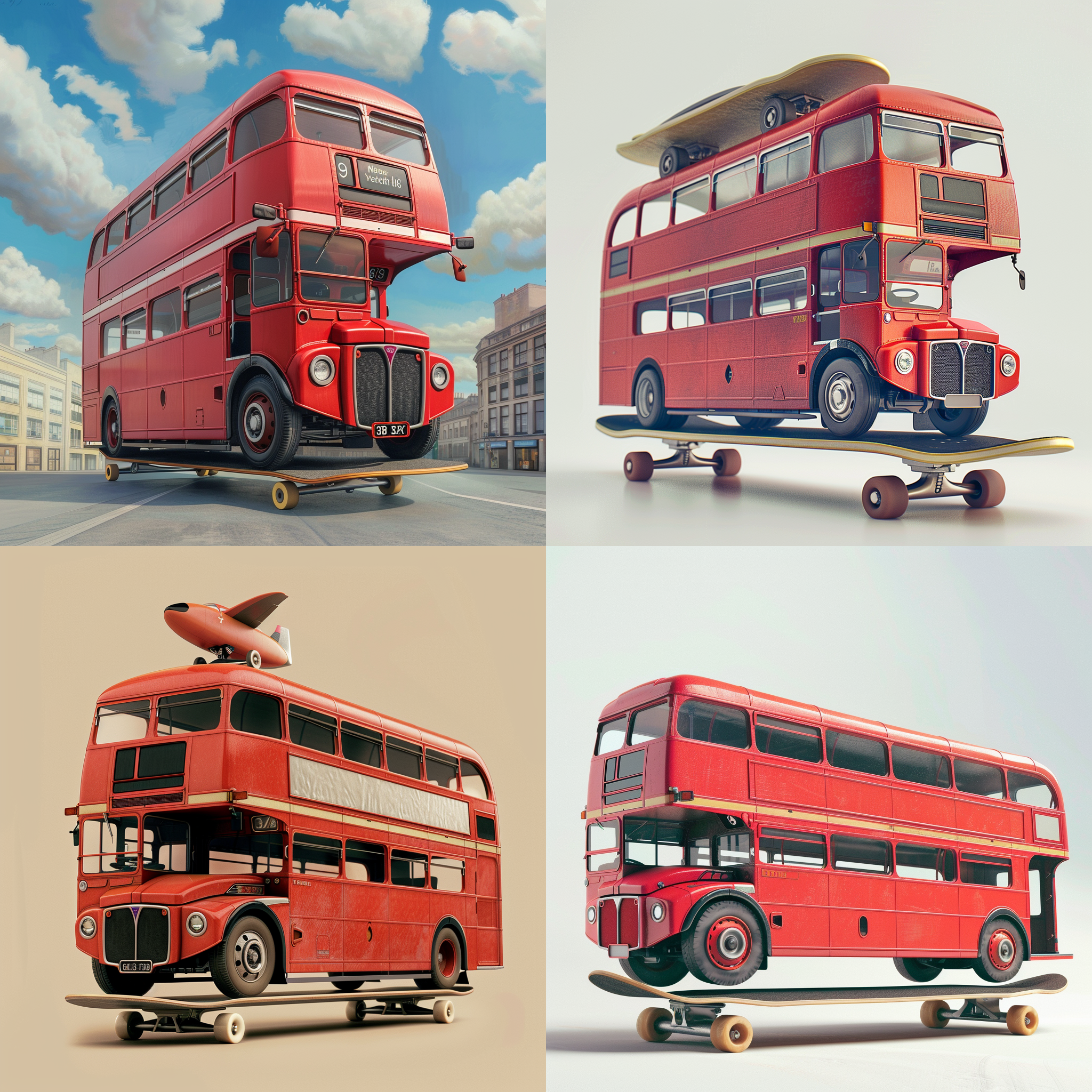 A large red double decker bus on a skateboard --seed 1557320846 --ar 1:1 --v 6 | 2024-03-17T10:43:24Z | |