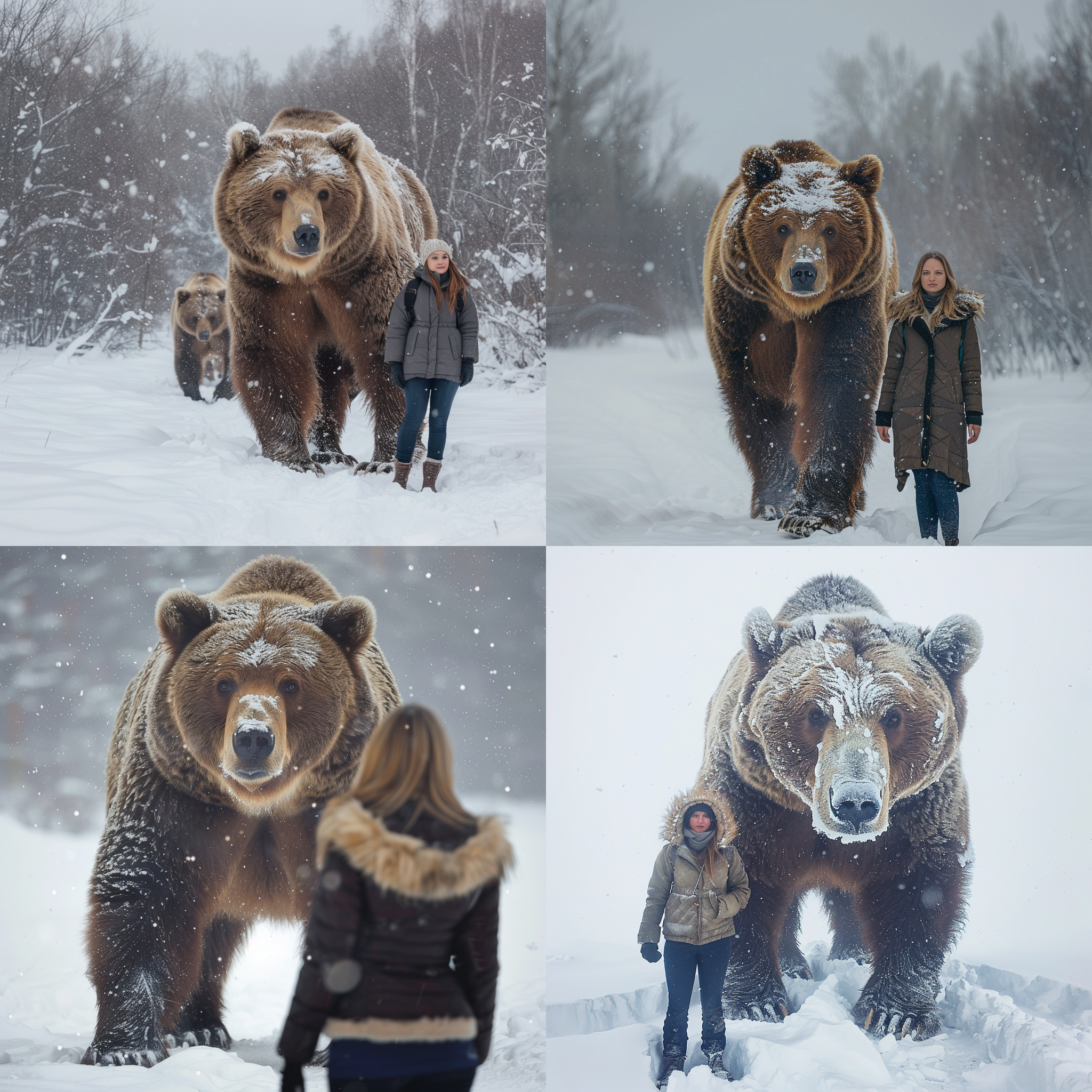 A woman stands in front of large brown bear walking in the snow --seed 2285191069 --ar 1:1 --v 6 | 2024-03-17T10:49:59Z | |