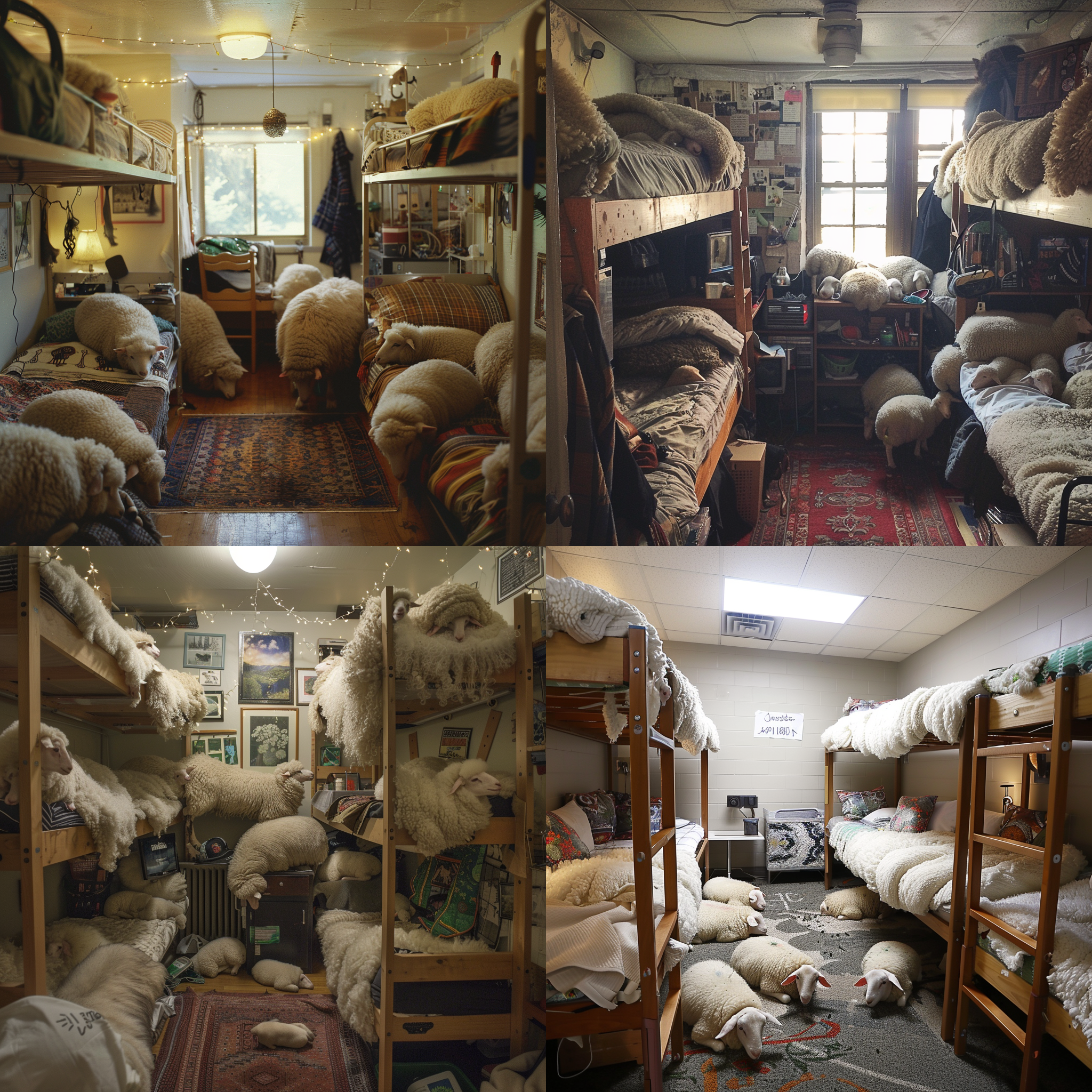 An small college dorm room with many sheep --seed 1213943521 --ar 1:1 --v 6 | 2024-03-17T10:39:27Z | |