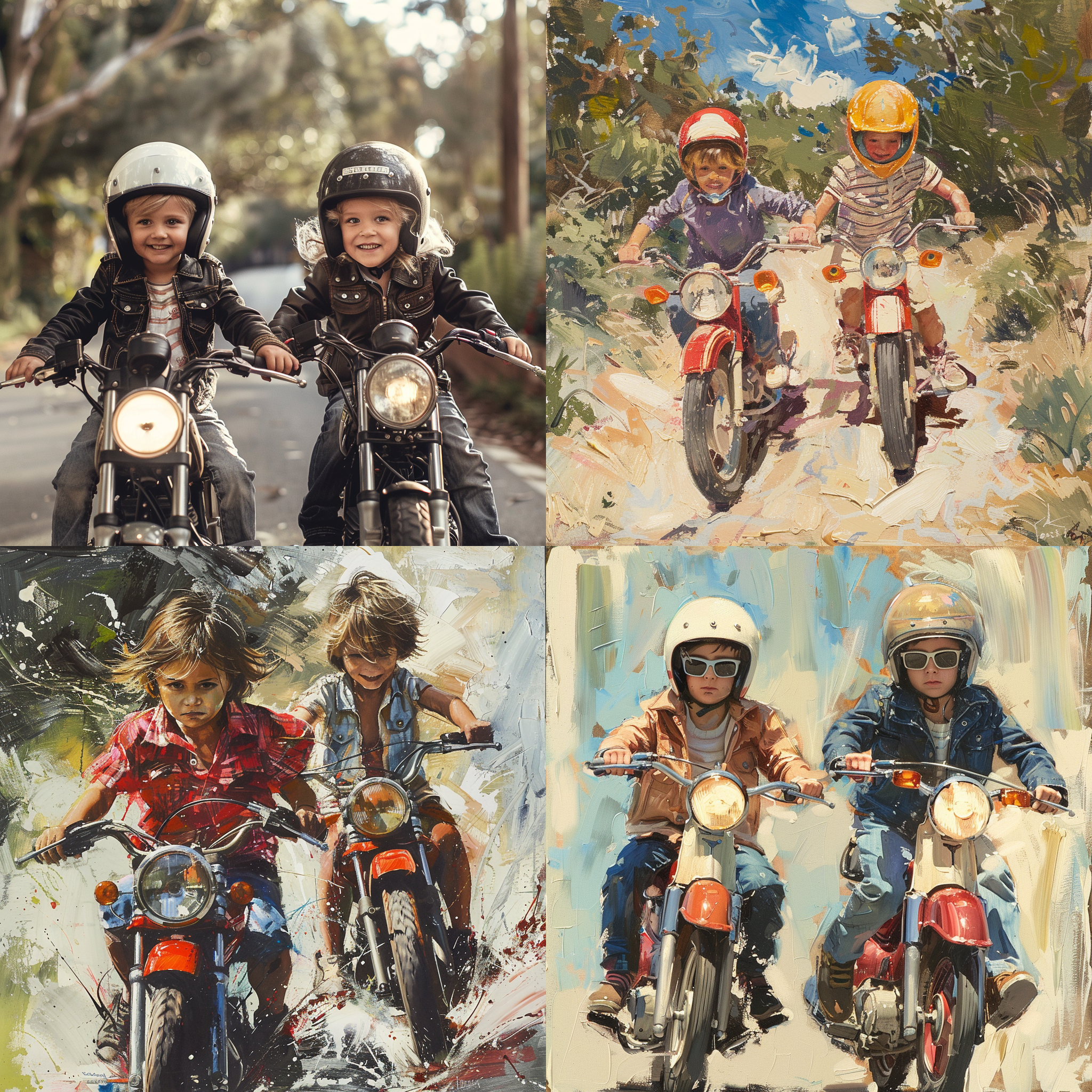 Two kids on motorbikes --seed 2574727216 --ar 1:1 --v 6 | 2024-03-17T10:48:31Z | |