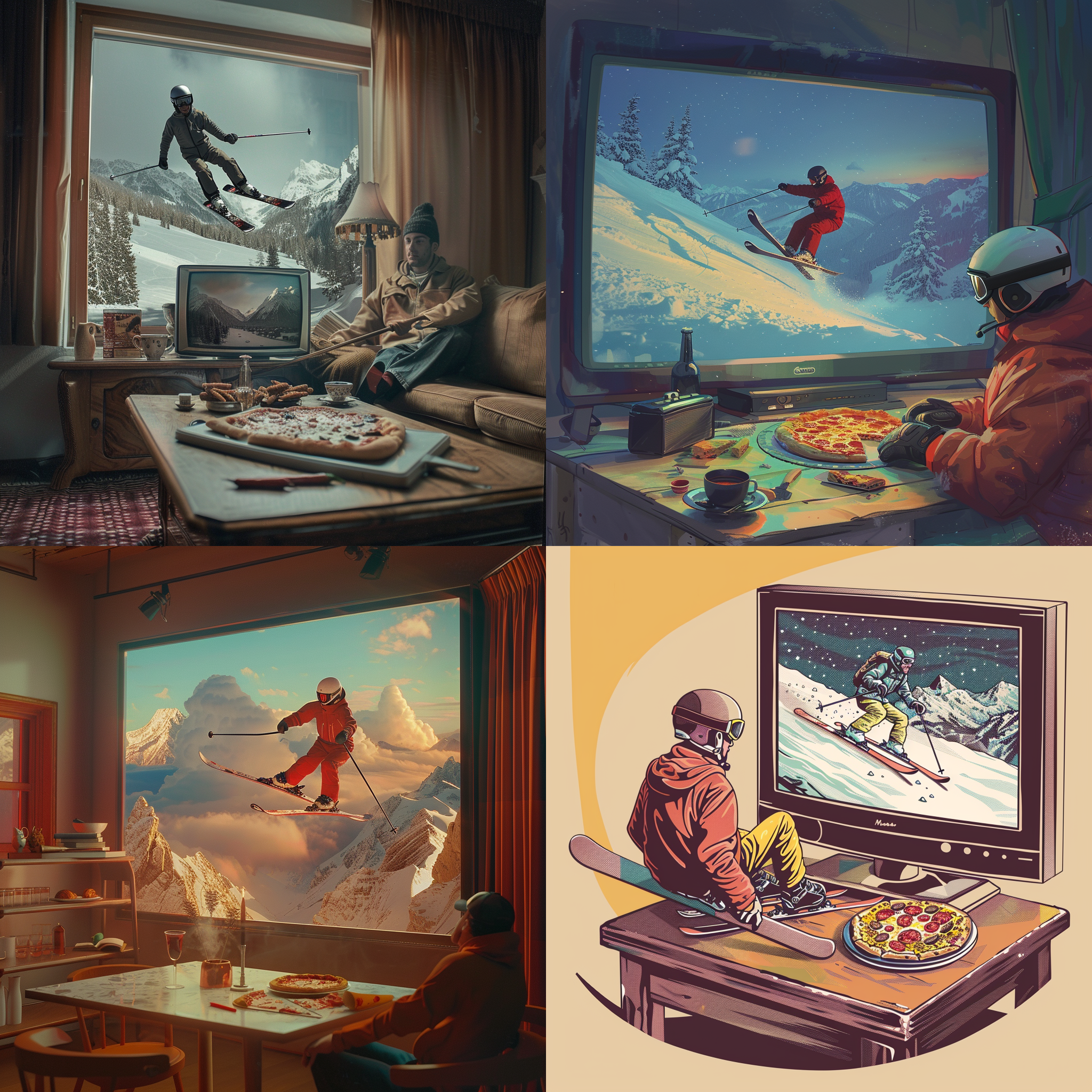 A man riding skis on a big tv is sitting on a table with pizza --seed 1526691692 --ar 1:1 --v 6 | 2024-03-17T10:48:02Z | |