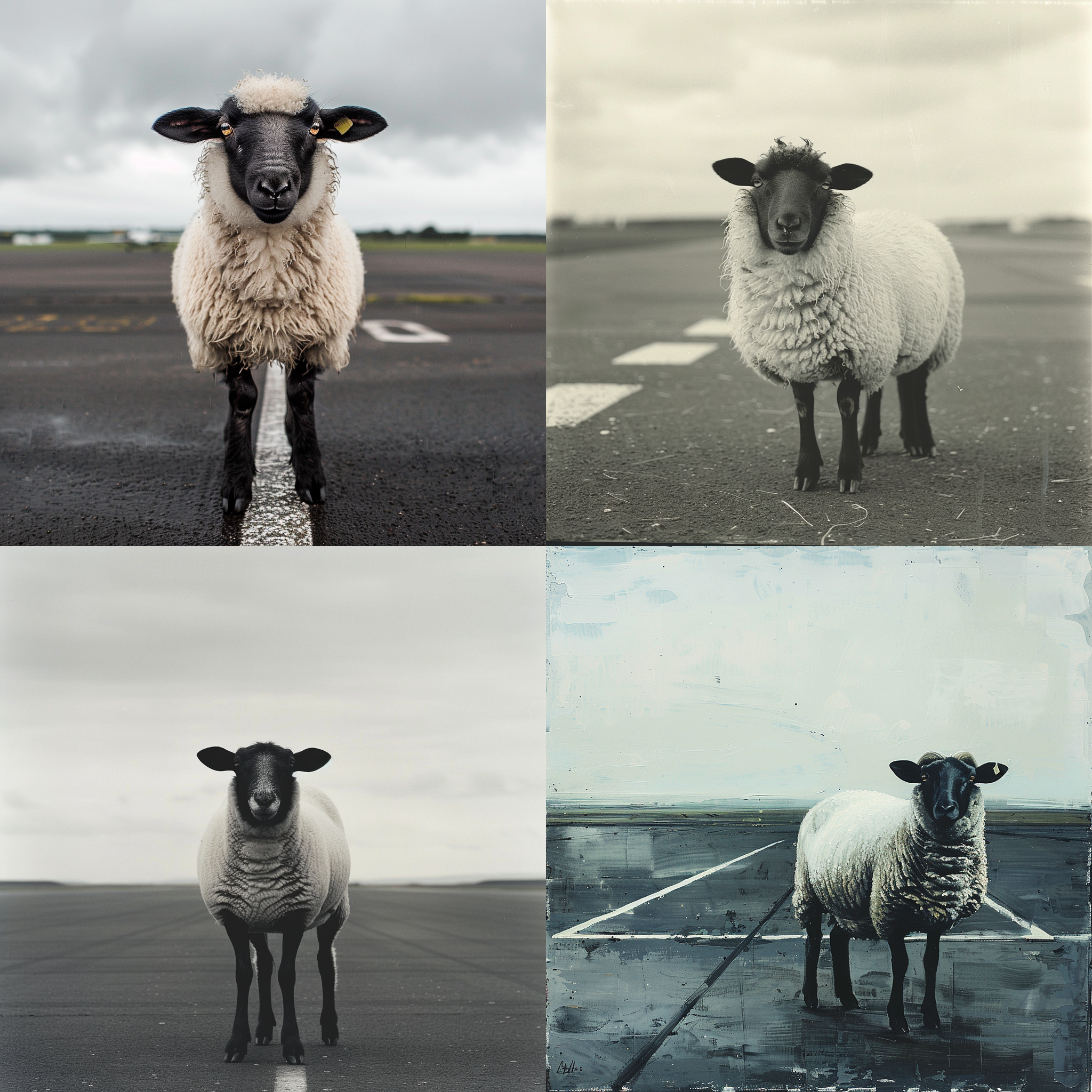 A black and white sheep standing on the tarmac --seed 4160492530 --ar 1:1 --v 6 | 2024-03-17T10:44:29Z | |