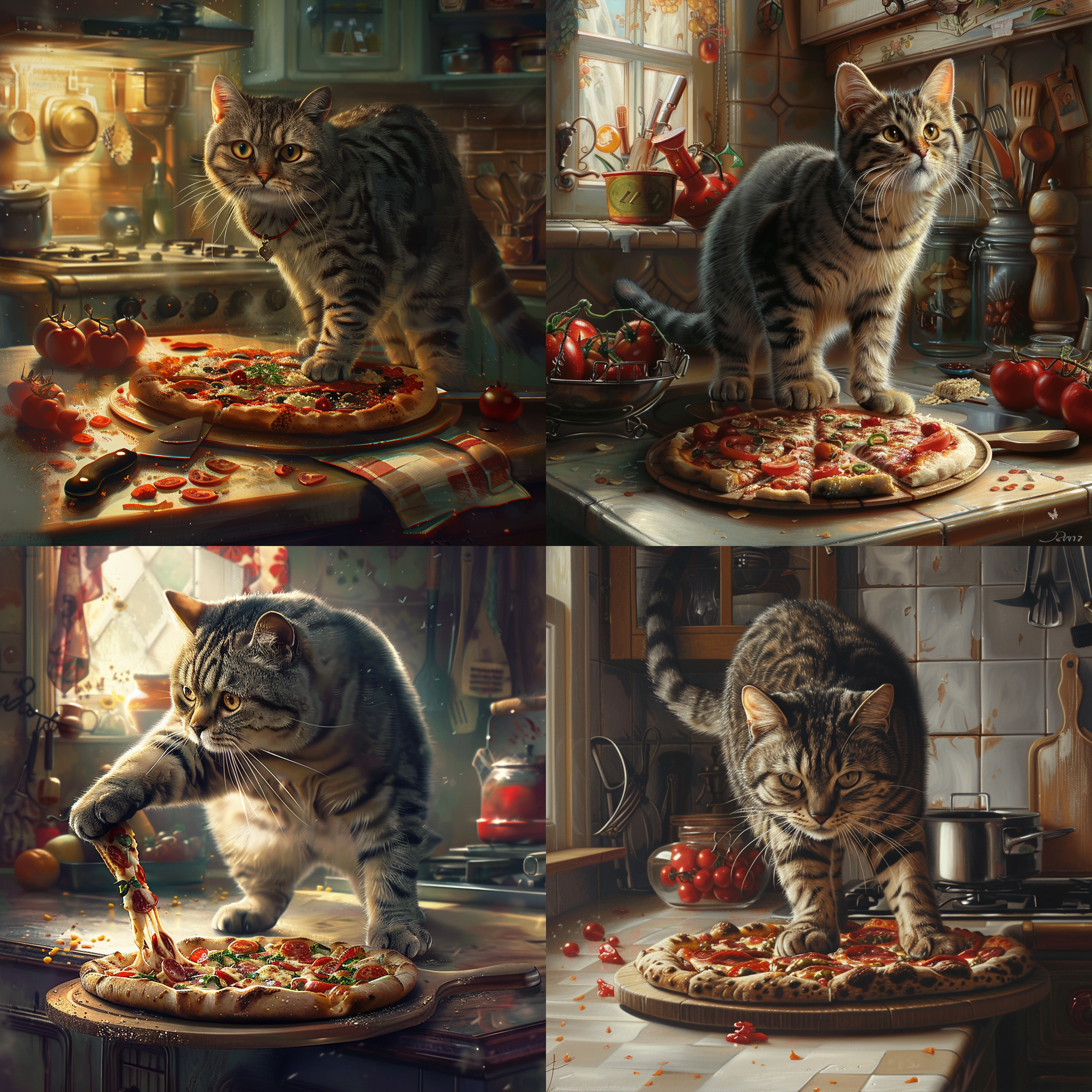 A gray tiger cat standing on the edge of a pizza pie with toppings in a kitchen --seed 3248979292 --ar 1:1 --v 6 | 2024-03-17T10:39:08Z | |