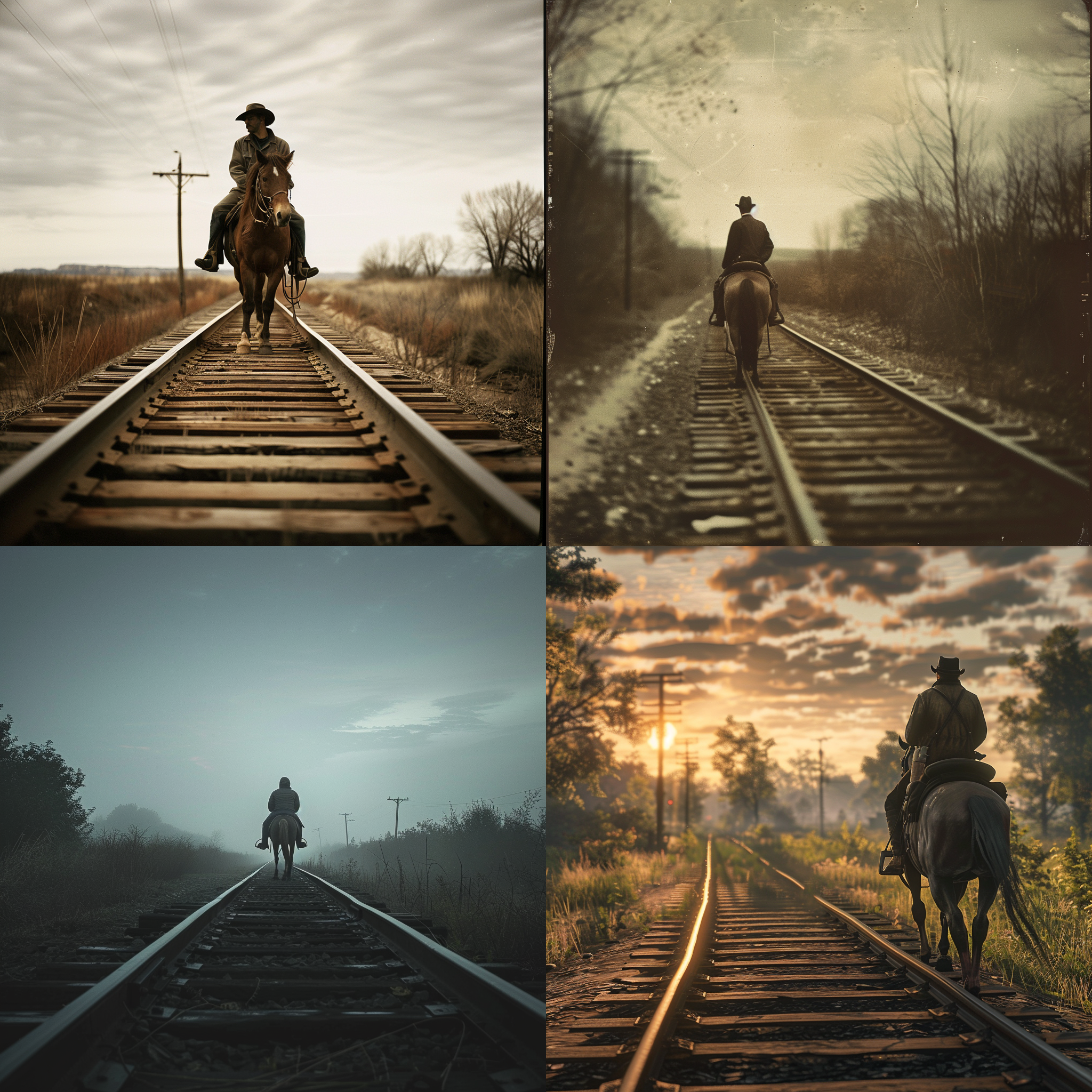 A man sits in a horse on the edge of the railroad tracks --seed 3537691293 --ar 1:1 --v 6 | 2024-03-17T10:46:58Z | |