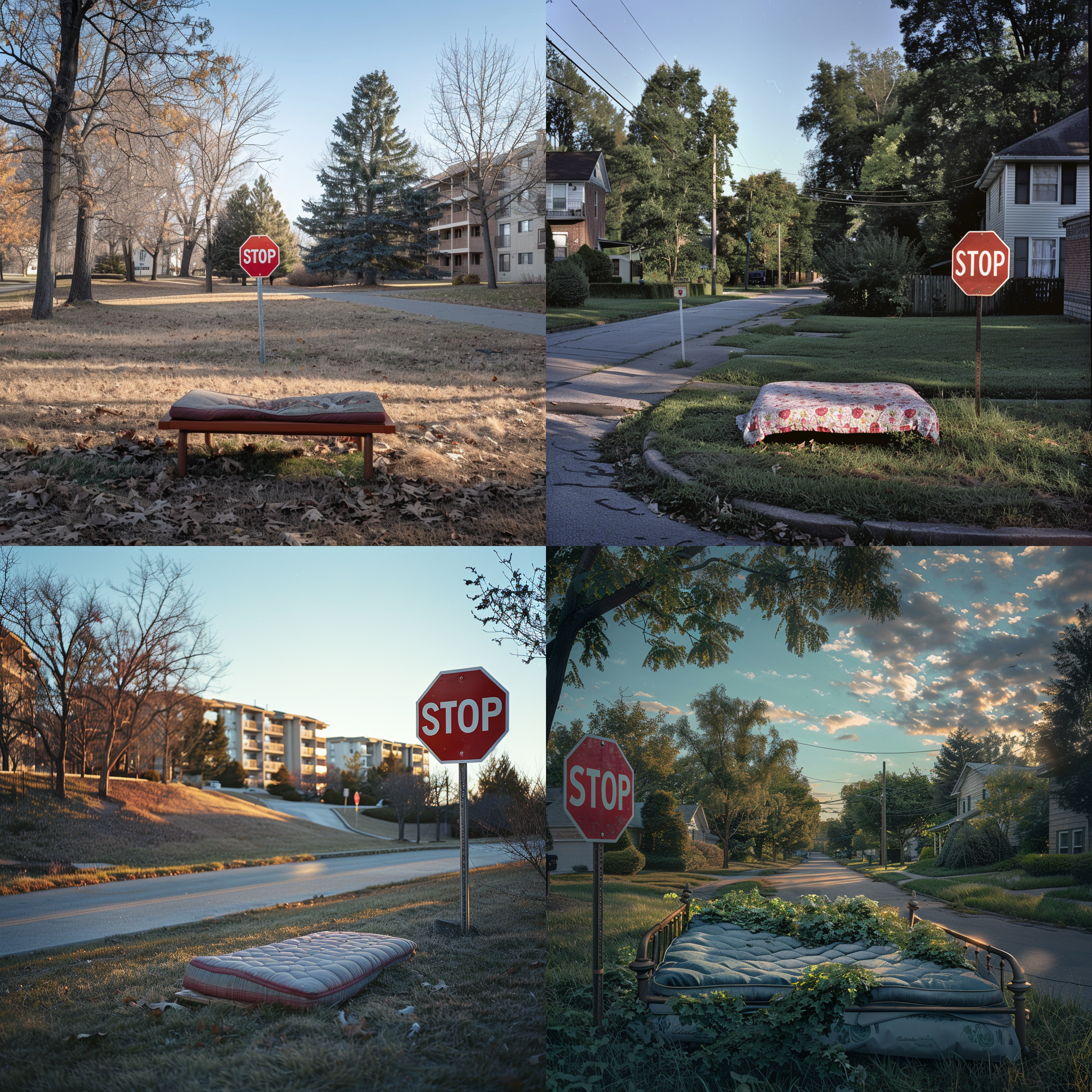 There is a stop sign sitting on a bed in residential area a large park --seed 3541887304 --ar 1:1 --v 6 | 2024-03-17T10:37:03Z | |