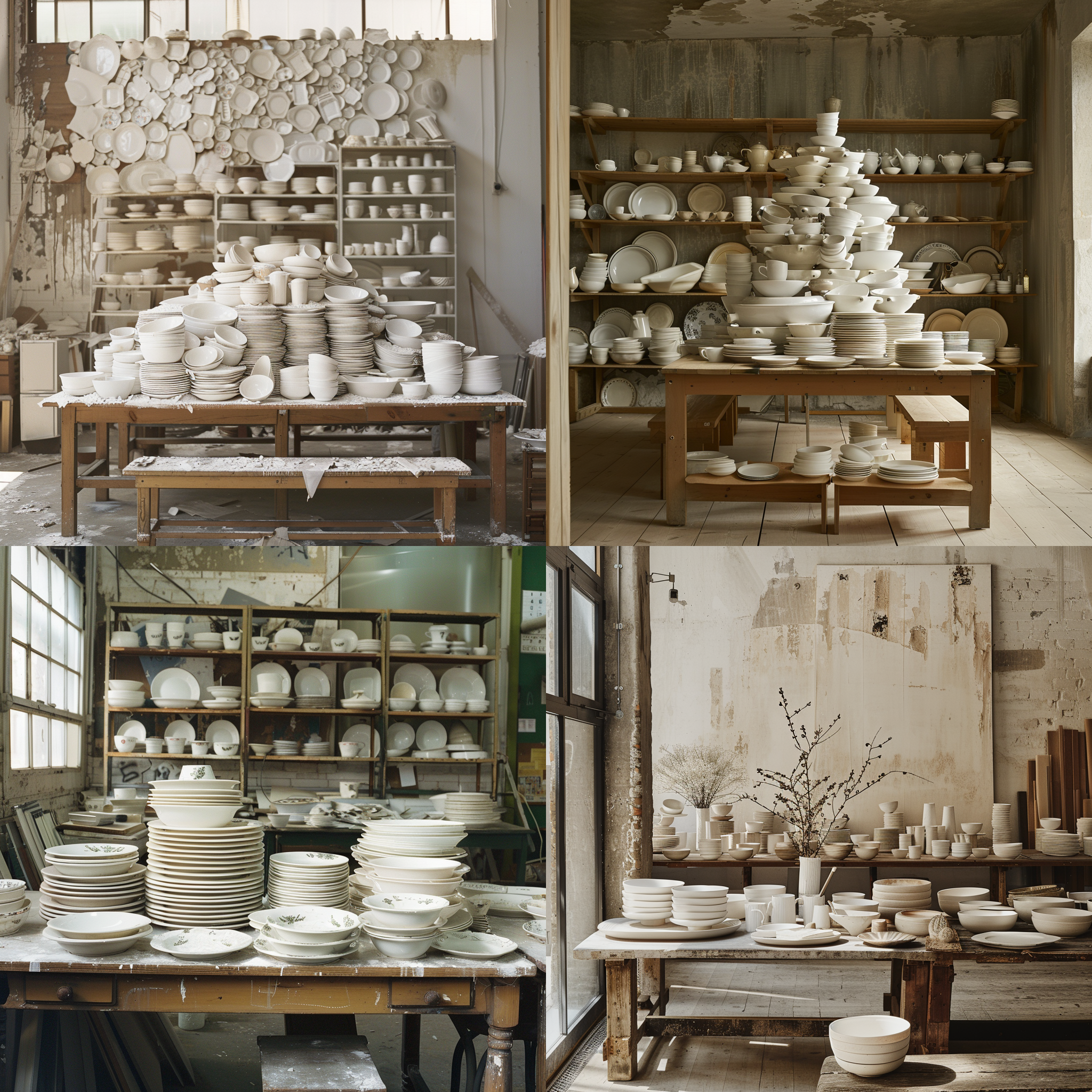An office desk is covered in white dishes sit atop benches --seed 3776651329 --ar 1:1 --v 6 | 2024-03-17T10:44:42Z | |