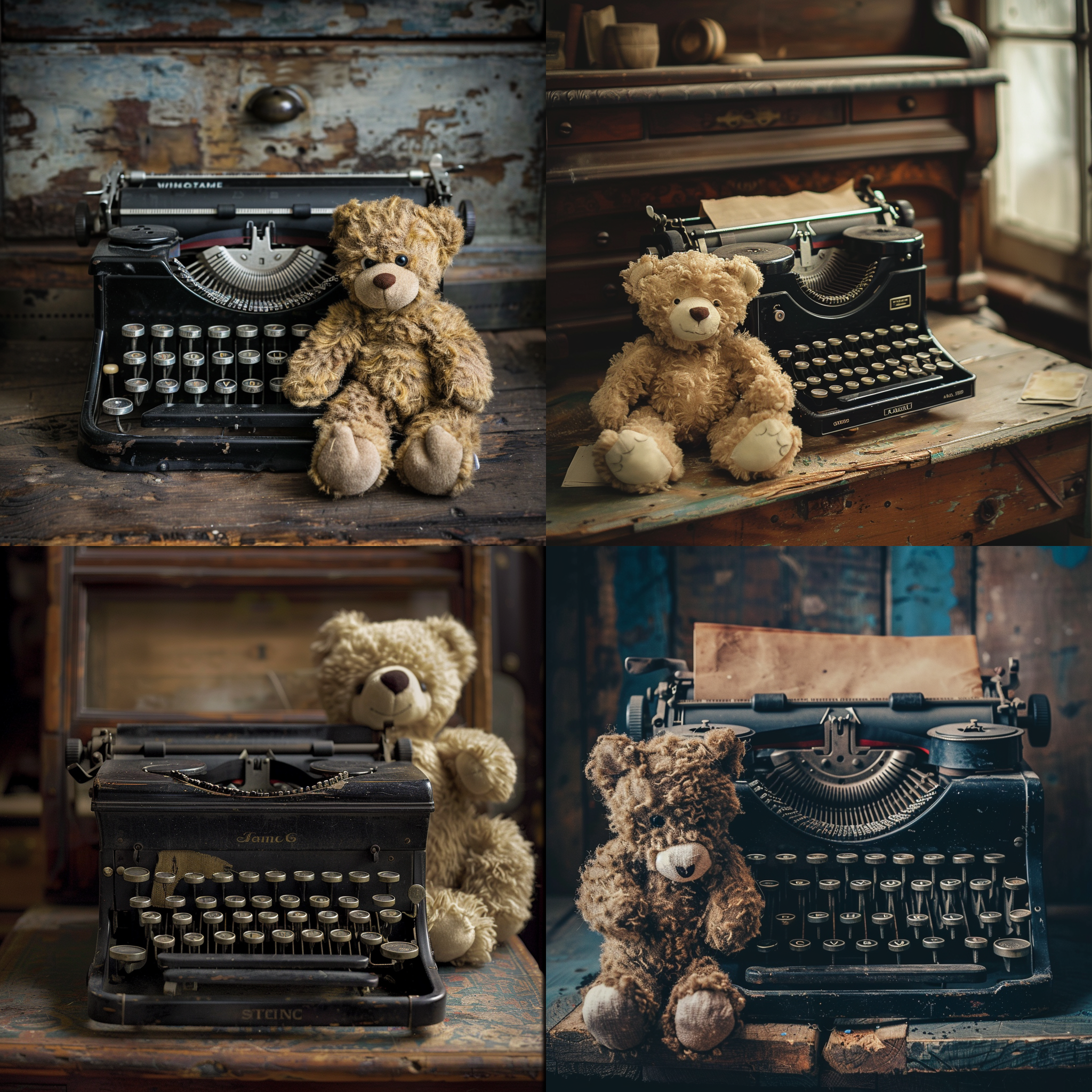 An old black typewriter in the middle of a teddy bear sitting in front of it --seed 1824676752 --ar 1:1 --v 6 | 2024-03-17T10:44:03Z | |