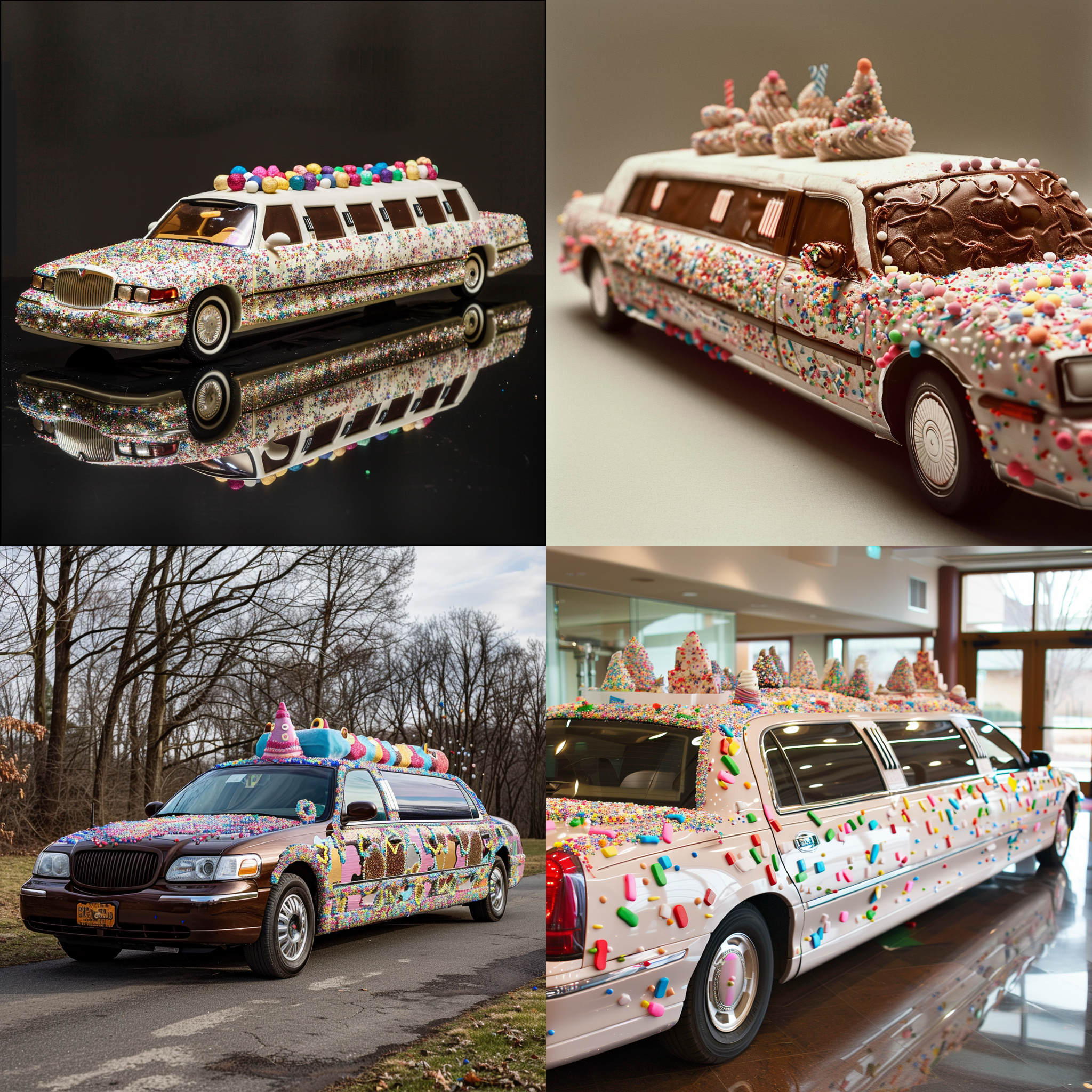 A stretch limousine decorated with frosting, chocolate, and sprinkles --seed 1555399461 --ar 1:1 --v 6 | 2024-03-17T10:41:13Z | |