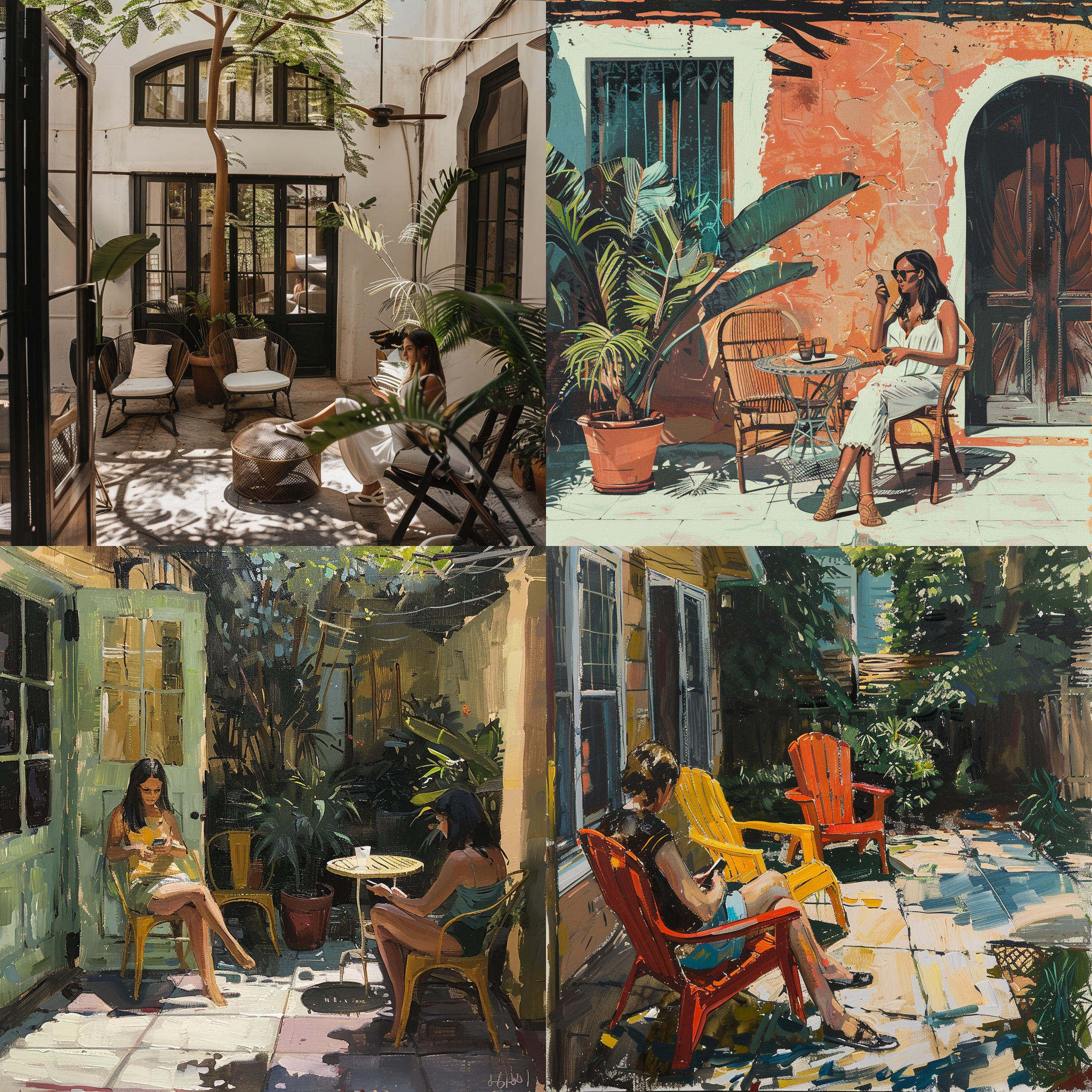 A patio with chairs and a woman holding her cell phone --seed 355842998 --ar 1:1 --v 6 | 2024-03-17T10:36:50Z | |
