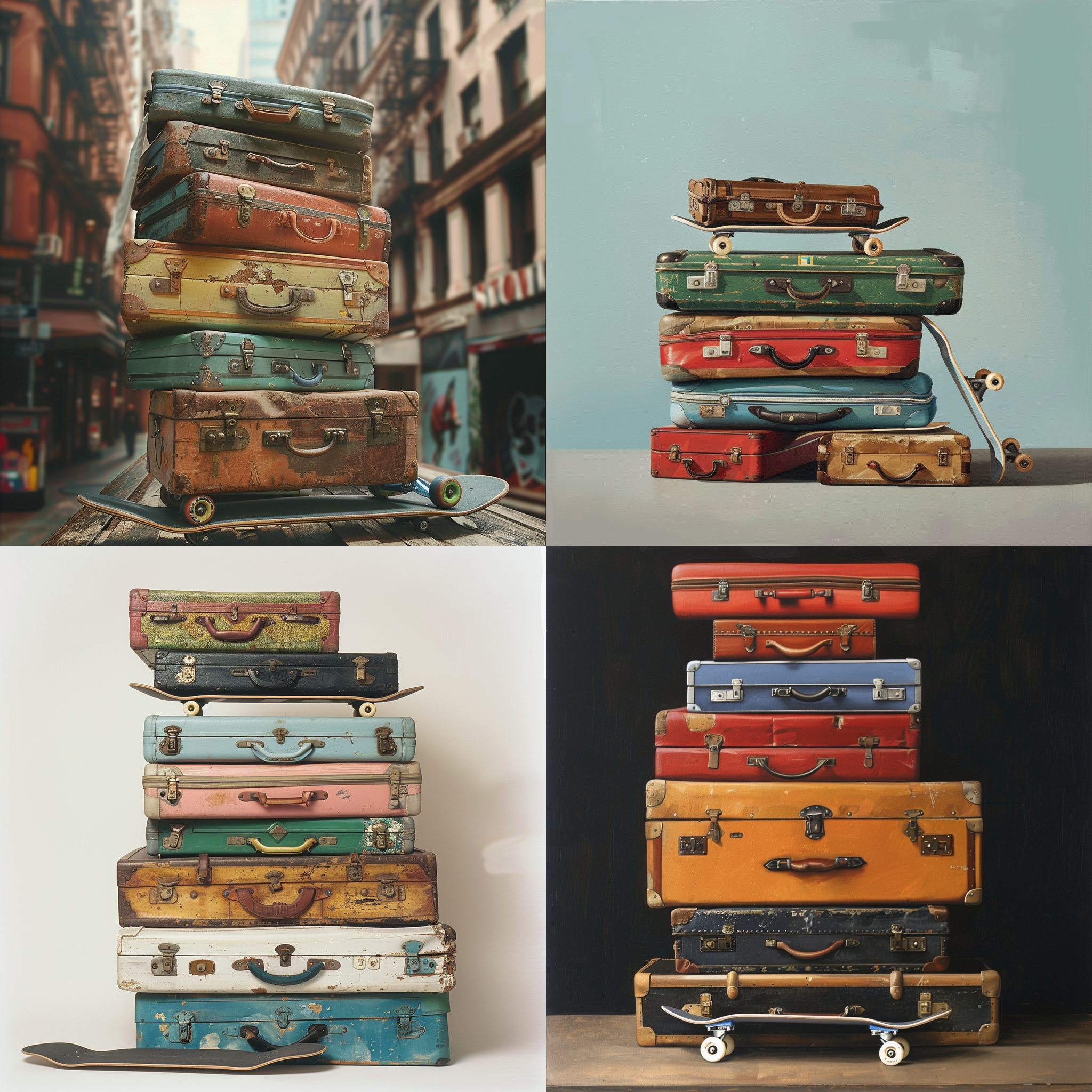 Several suitcases are piled up a skateboard --seed 1278984644 --ar 1:1 --v 6 | 2024-03-17T10:50:04Z | |