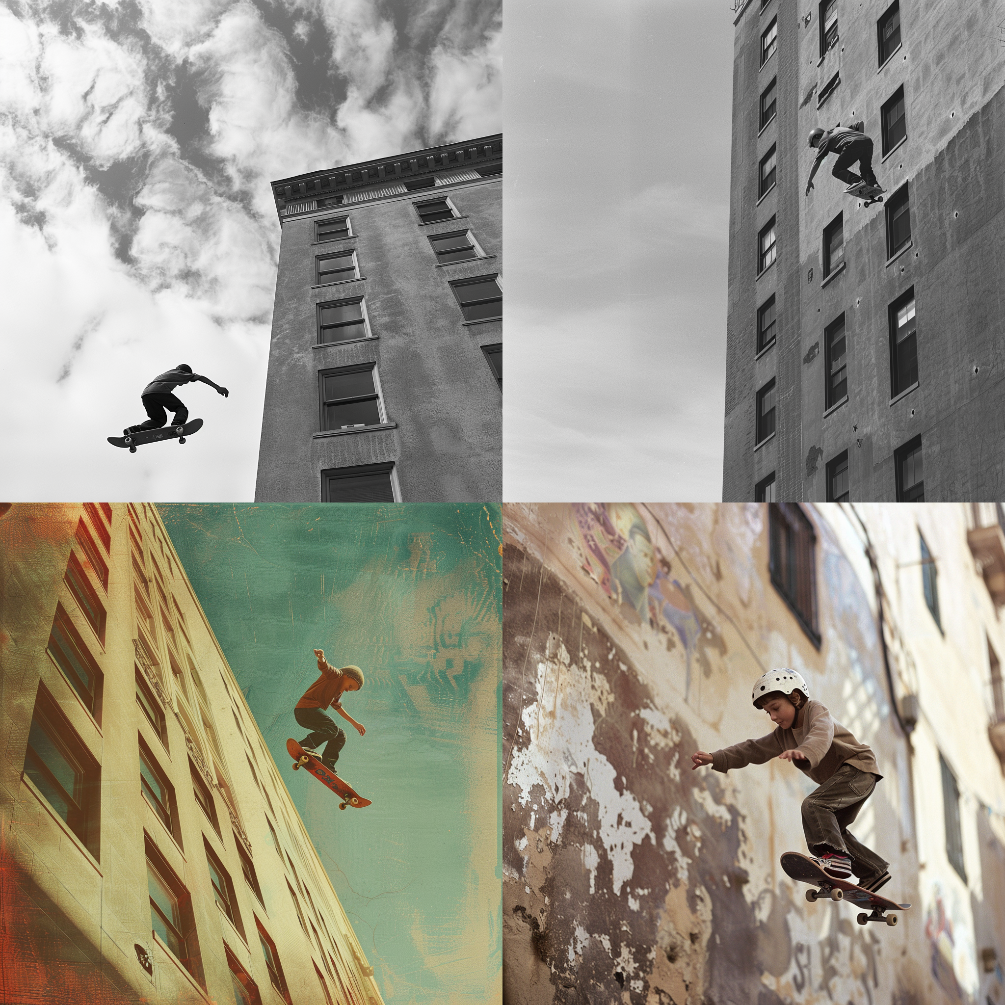A kid rides a skateboard up the side of a building --seed 3073528297 --ar 1:1 --v 6 | 2024-03-17T10:48:52Z | |