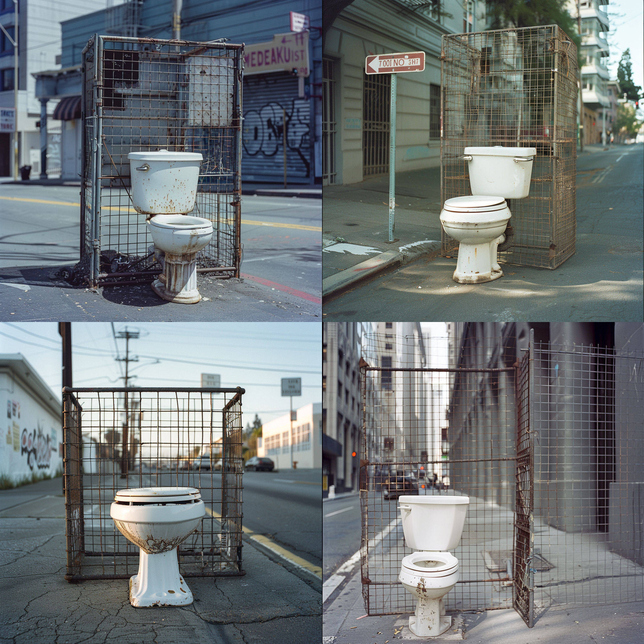 A white toilet sitting in the street behind a cage A street sign on the road --seed 1639391925 --ar 1:1 --v 6 | 2024-03-17T10:44:04Z | |