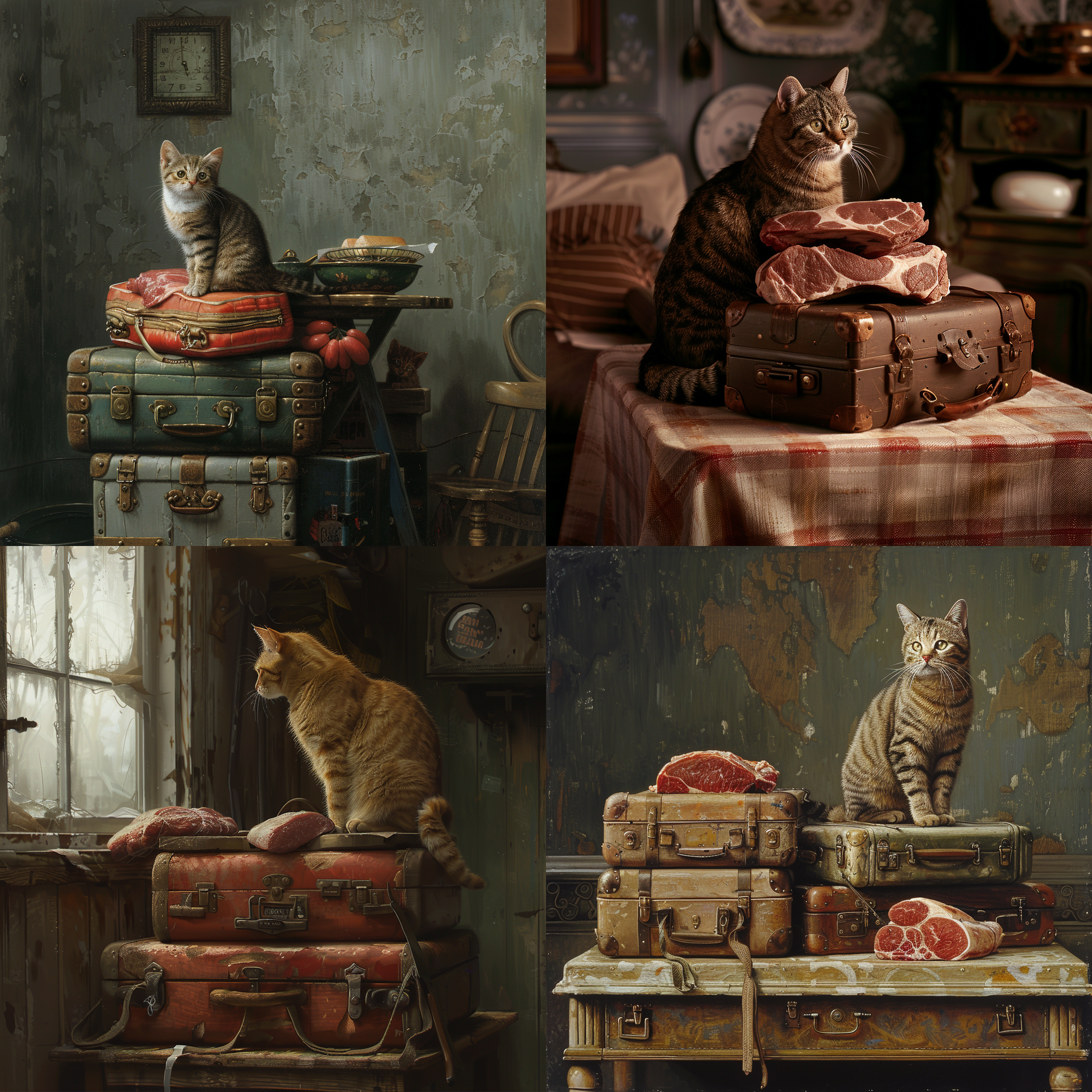 A cat sitting at a table Several bags of luggage is stacked with meat on it --seed 427873823 --ar 1:1 --v 6 | 2024-03-17T10:49:12Z | |