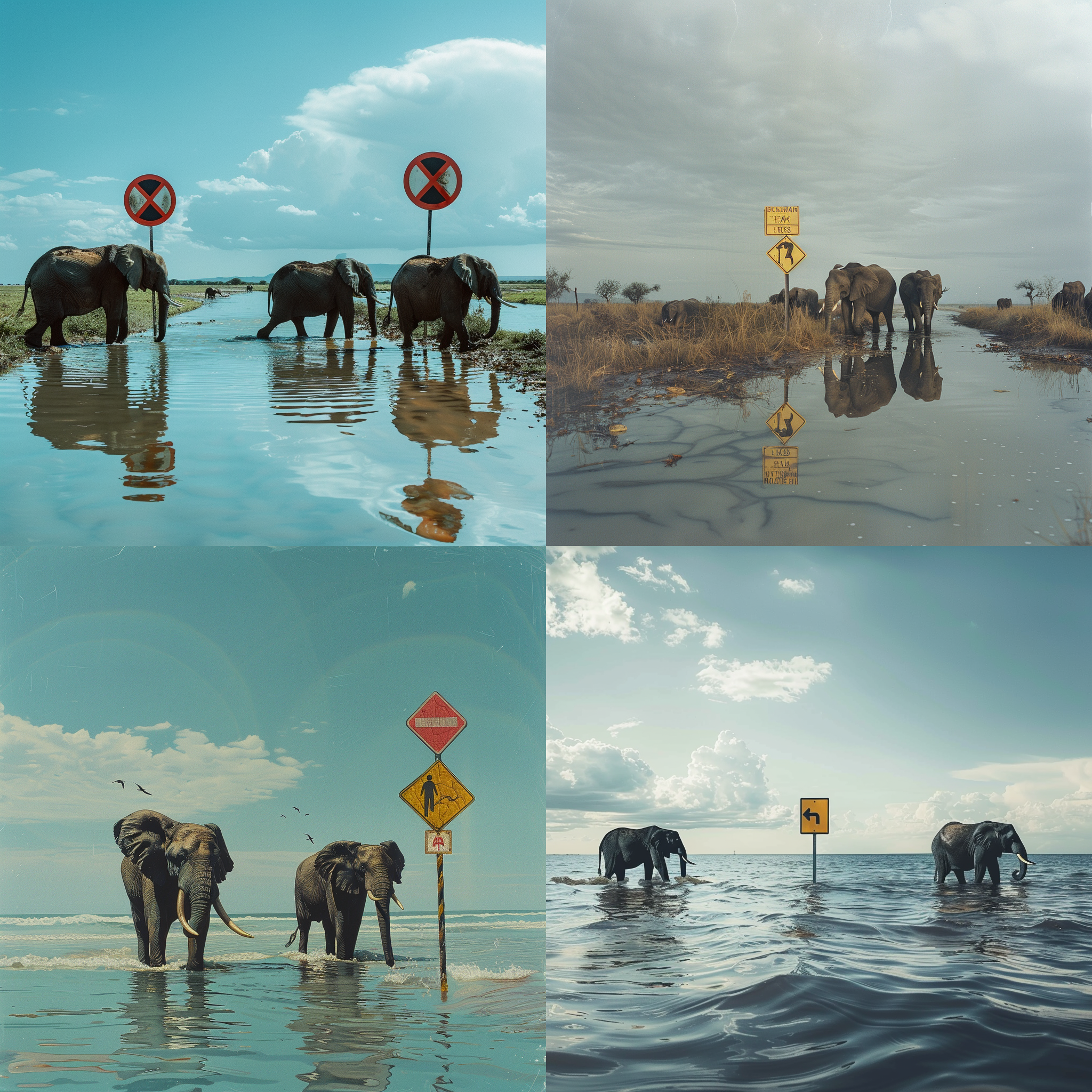 a couple of traffic signs and a herd of elephants standing in th water --seed 3392615034 --ar 1:1 --v 6 | 2024-03-17T11:19:16Z | |