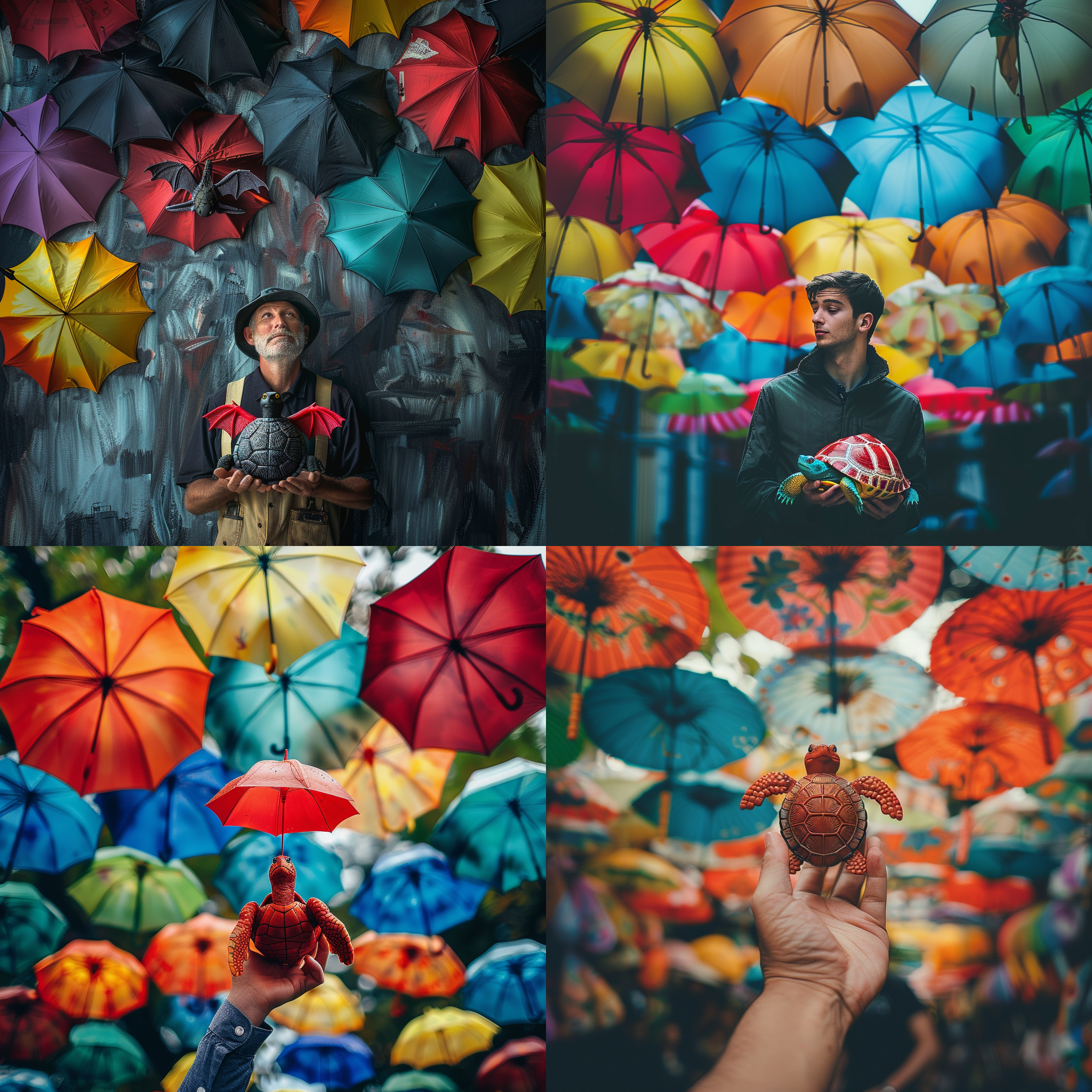 A man holding a red bat A turtle toy placed next to colorful umbrellas --seed 3824535166 --ar 1:1 --v 6 | 2024-03-17T11:21:54Z | |